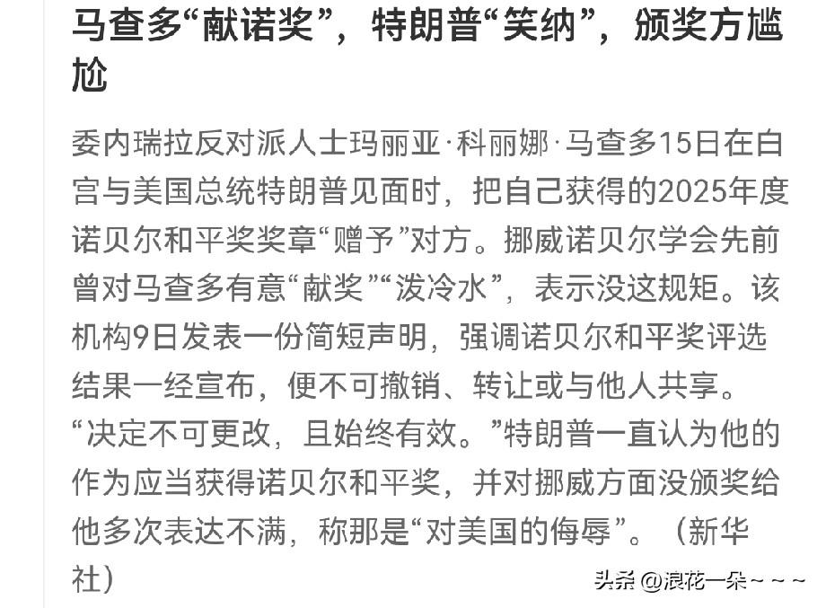 夜深了,看到这一段,突然想,在美国当官,都要向特朗普学习,脸皮要厚,你看转了一大圈,去年的诺贝尔和平奖又到特朗普手里去了! 马查多“上供”,将特朗普“笑纳”!这事儿办的漂亮。马查多确实可以,有里儿有面儿,脑袋瓜很灵光。 当然,特朗普既然是笑纳,那肯定脸皮得厚啊,脸皮不厚怎么好意思着要呢?也不知道是什么原因,难道他感觉到今年没希望了吗?