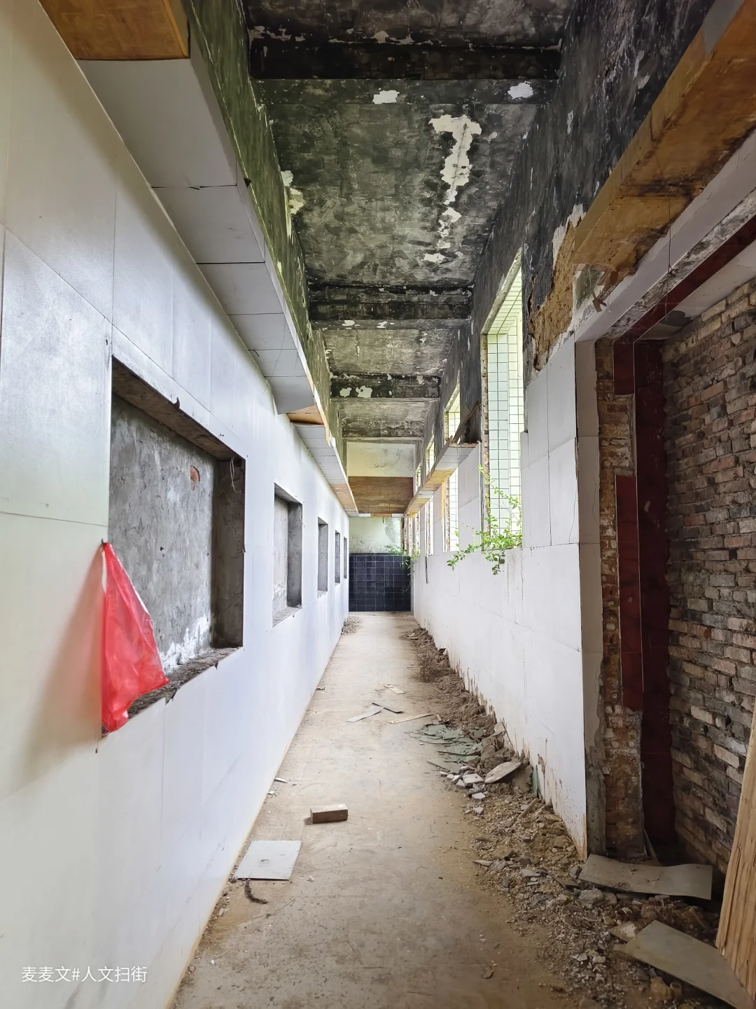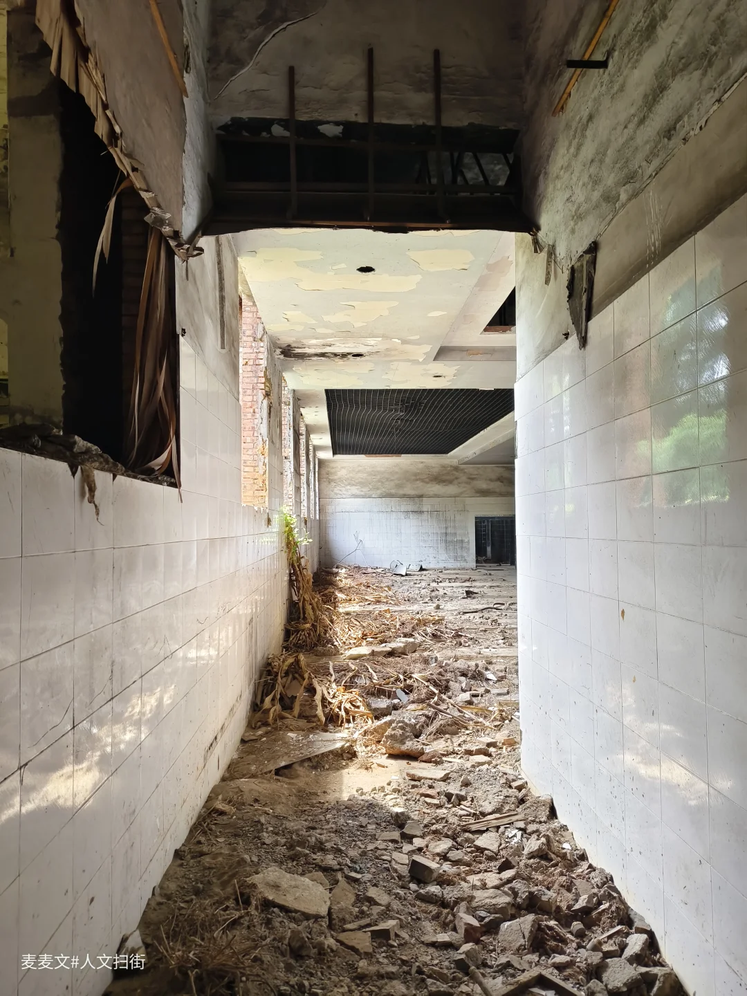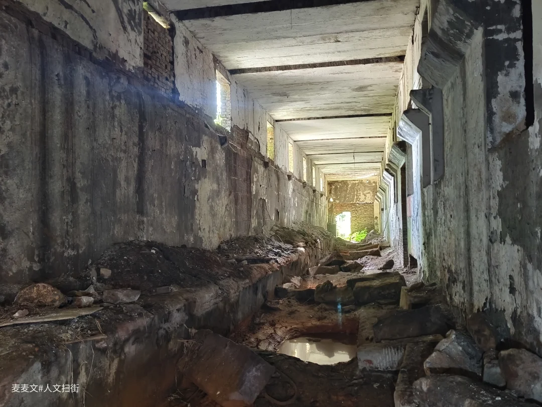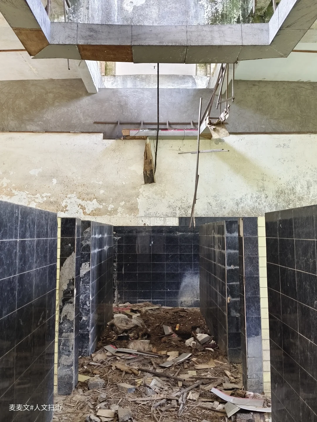 踏入这处曾经的职工浴室,时光仿佛在此凝固。斑驳的水泥天花板诉说着岁月的侵蚀,两旁的建筑结构虽仍矗立,却也尽显颓态。墙面上的白色瓷砖,曾经或许是洁净明亮的,如今却蒙上了污渍与尘埃。