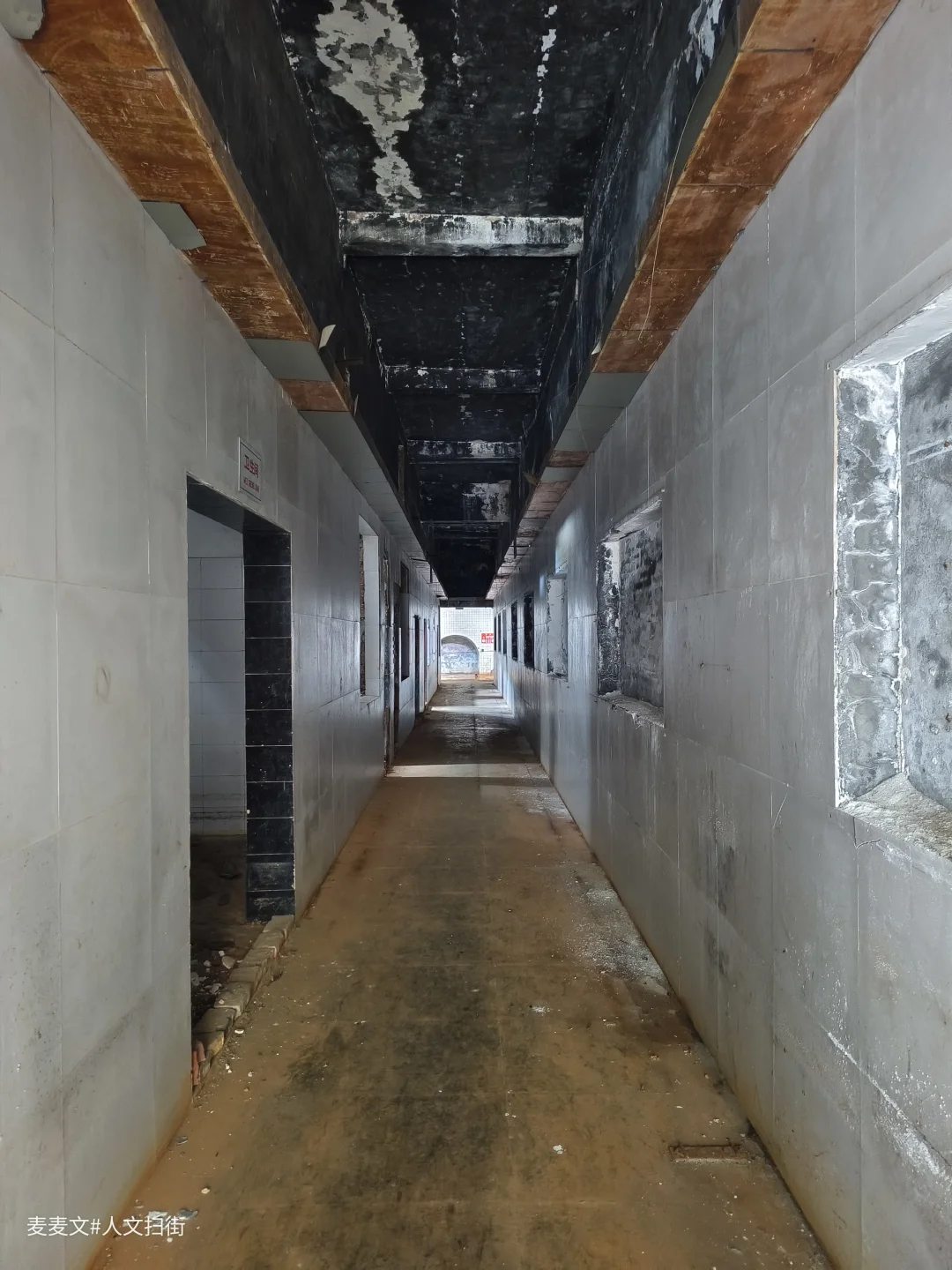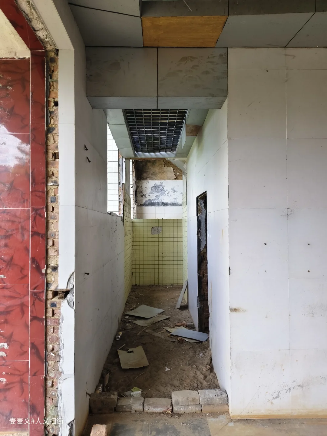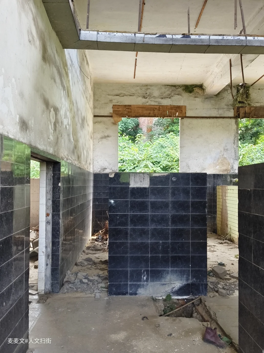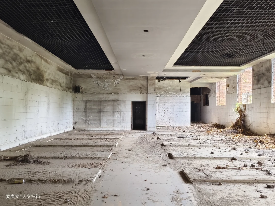 踏入这处曾经的职工浴室,时光仿佛在此凝固。斑驳的水泥天花板诉说着岁月的侵蚀,两旁的建筑结构虽仍矗立,却也尽显颓态。墙面上的白色瓷砖,曾经或许是洁净明亮的,如今却蒙上了污渍与尘埃。