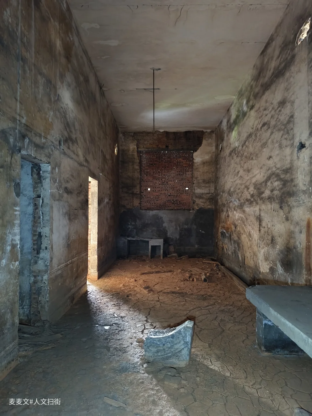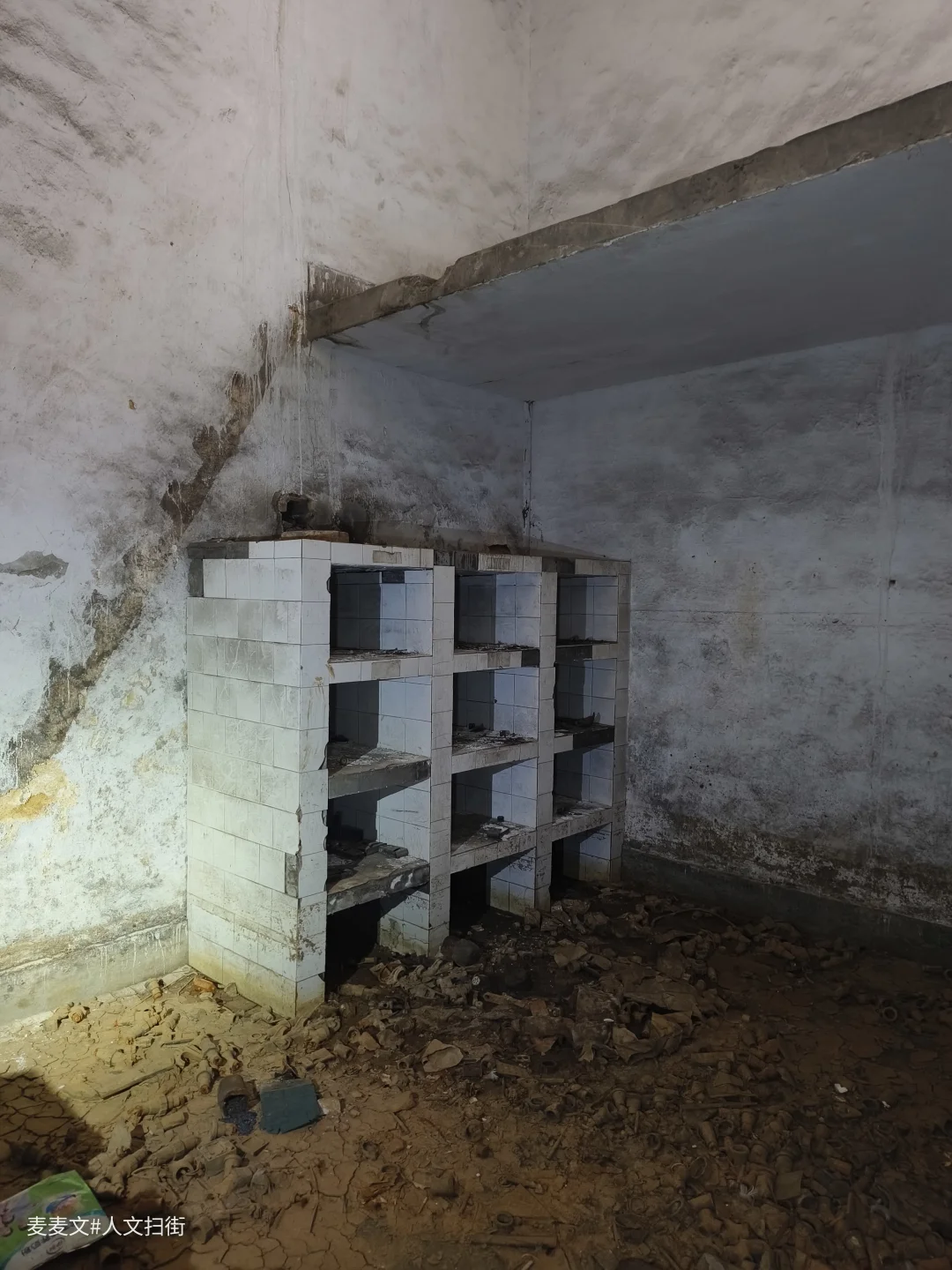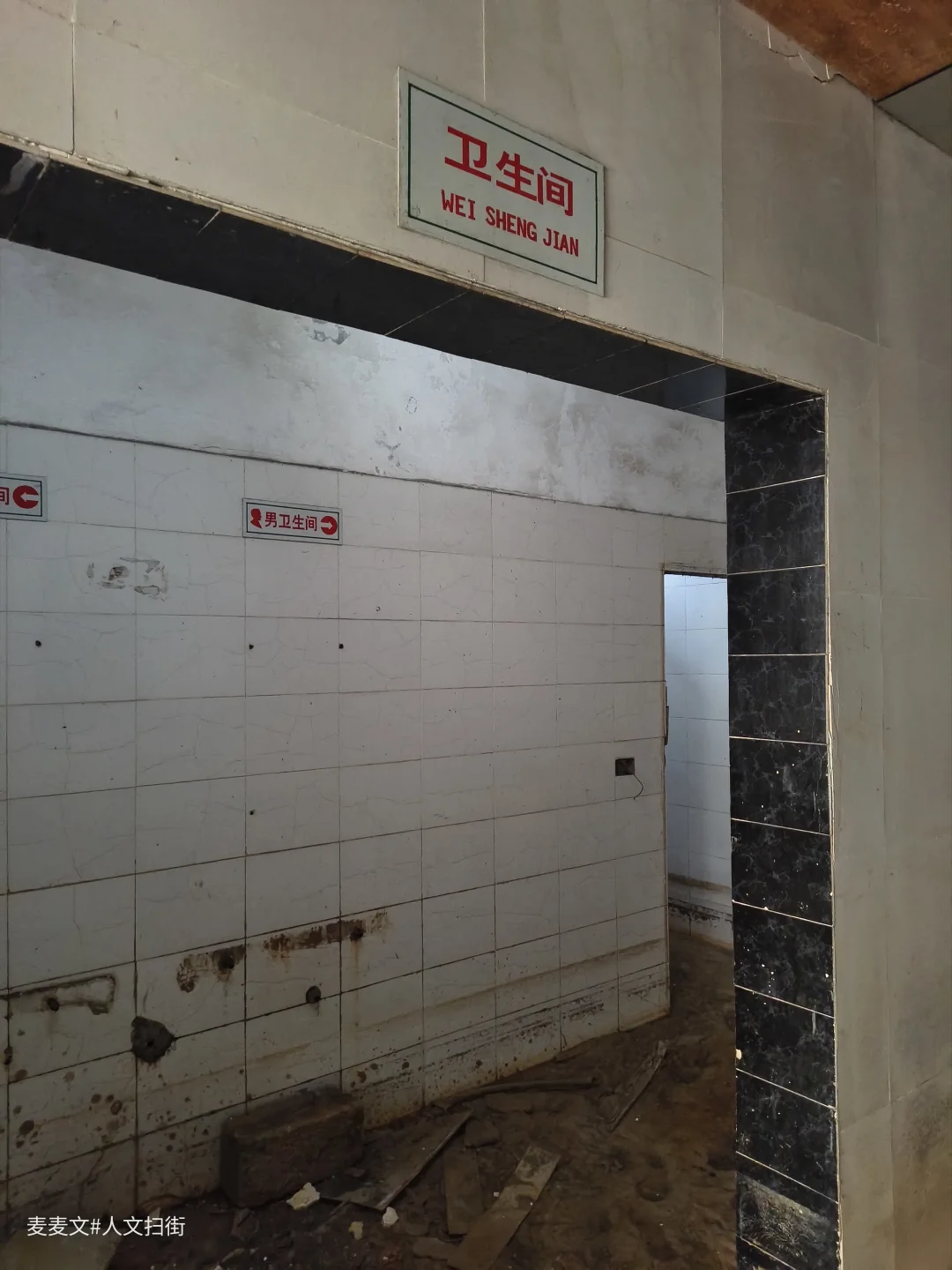 踏入这处曾经的职工浴室,时光仿佛在此凝固。斑驳的水泥天花板诉说着岁月的侵蚀,两旁的建筑结构虽仍矗立,却也尽显颓态。墙面上的白色瓷砖,曾经或许是洁净明亮的,如今却蒙上了污渍与尘埃。