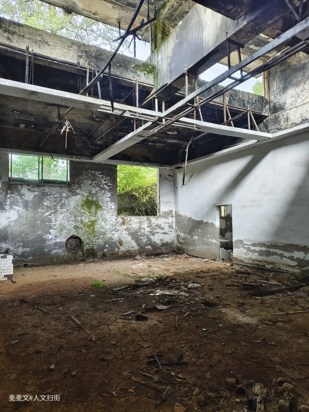 透过上方的窗户,能看到外面葱郁的植被,自然的绿意与室内的荒芜形成鲜明对比,仿佛在诉说着曾经的热闹与如今的寂静,让人不禁对公共澡堂过往的故事浮想联翩。这里的一切都是时间留下的深刻印记,静静讲述着往昔的故事,等待着被人倾听。