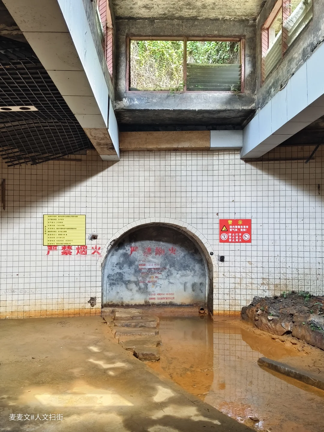 矿井门洞十年前就已封闭,上方“严禁烟火”的红漆字样虽已有些脱落,却依旧醒目,仿佛在坚守着曾经的告诫。旁边的警示标识也在默默提醒着潜在的危险。地面上积着浑浊的污水,泛着锈迹般的暗红,几级石阶没入水中,仿佛在阻挡着人们贸然前行。
