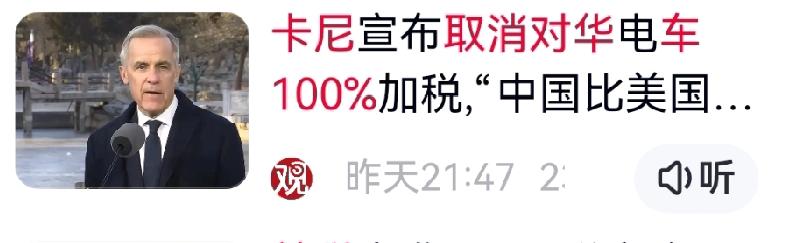 卡尼在北京“点头”,加拿大取消对华电动车100%高额关税!九年僵局被打破,6.1%最惠国税率、4.9万辆配额,意味着中国新能源汽车获得进入北美市场的重要通道。 面对“美国优先”与脱钩压力,卡尼政府选择重启对华战略合作。这不仅为加拿大工业引来技术与供应链支持,更以30亿美元农产品订单激活经济,避免沦为单一资源出口国。 此次转变,是加拿大在关键节点为自身国运“止损”——摆脱单边依赖,重塑自主外交。中国则赢得北美合作新支点。中加联手,正成为打破贸易壁垒、重构区域共赢的鲜活信号。 对此你怎么看? 对华电动车关税 加拿大电动汽车