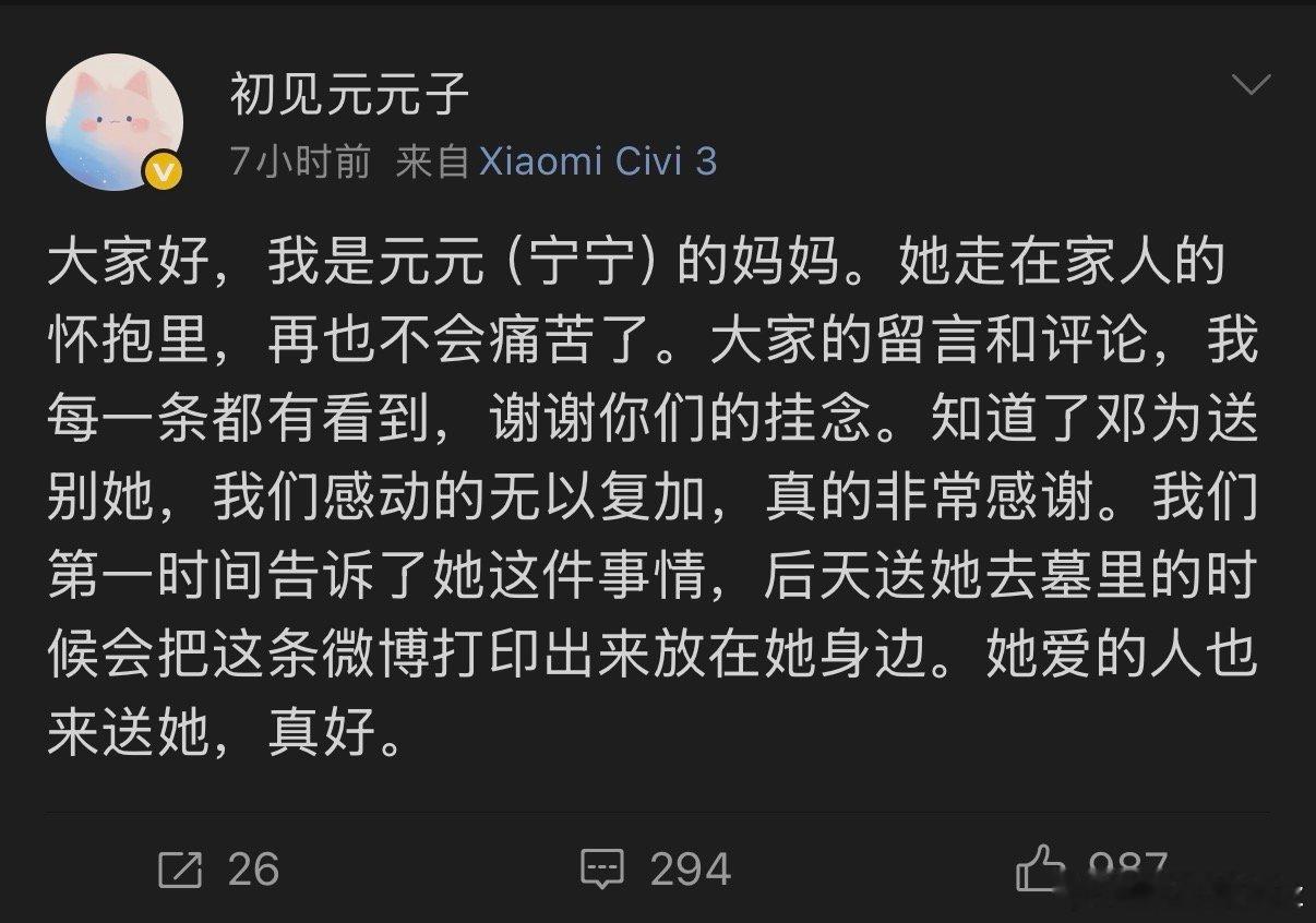 去世粉丝家人说感谢邓为 邓为昨晚空降超话悼念去世粉丝,粉丝妈妈看到发文回复说感谢邓为,并会把这条微博打印出来放在她身边,希望元元在天堂可以感受到邓为的心意,一路走好。