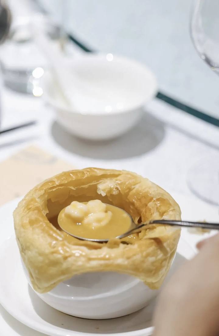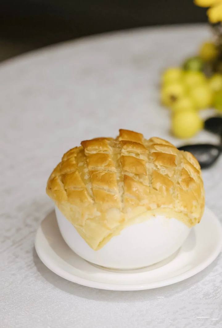 清塘所得小龙虾,烹制成一道酥皮龙虾汤,酥皮包覆碗口,状若菠萝包,俏皮可喜。