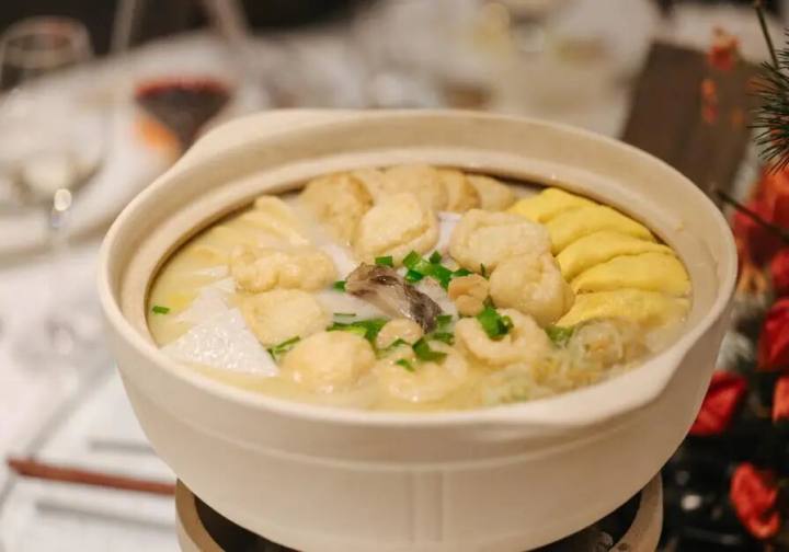 西溪暖锅自然也是鱼汤为底,取青鱼干、鱼糕、蛋饺诸般食材,合成一幅全家福。慢炖后,咸香、鲜嫩、清甜交织,愈煮愈浓,渐入佳境。暖心暖胃,寒夜不寒。