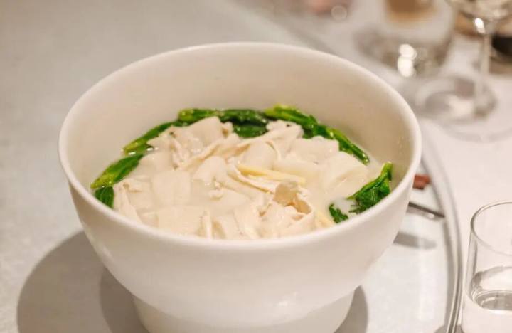 芙蓉鸡片将最柴的鸡胸肉薄透裹蛋清,汆入鱼汤,得雪白鸡片,形如芙蓉。搭配冬笋、竹荪、青菜,鱼汤为底,融合鸡嫩、笋脆、荪鲜。口感清爽,汤汁鲜醇,清淡却不寡淡。