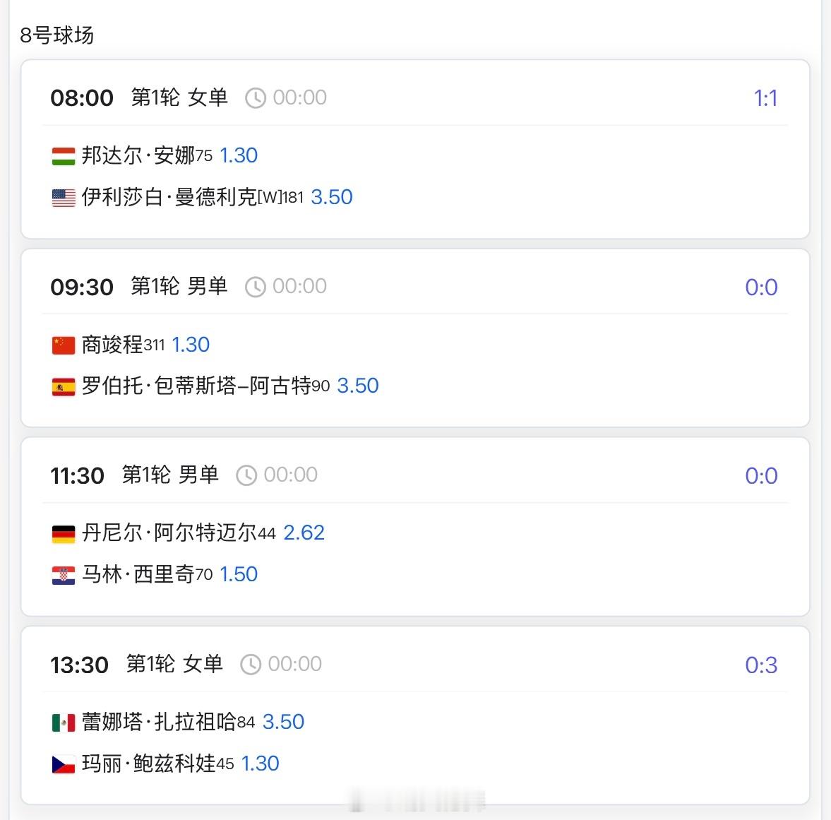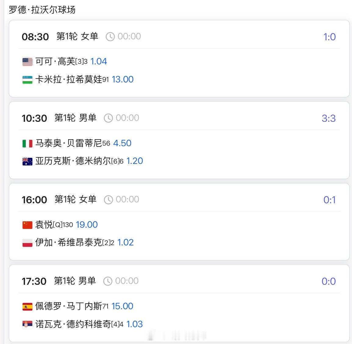 澳网2026 1.19正赛首轮赛程罗德·拉沃尔球场 第三场16:00 袁悦🇨🇳 vs 斯瓦泰克🇵🇱赔率:19 vs 1.02澳新银行 第四场14:30 布云朝克特🇨🇳 vs 沙波瓦洛夫🇨🇦赔率:2.75 vs 1.44八号球场 第二场09:30 商竣程🇨🇳 vs 阿古特🇪🇸赔率:1.3 vs 3.5
