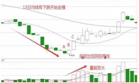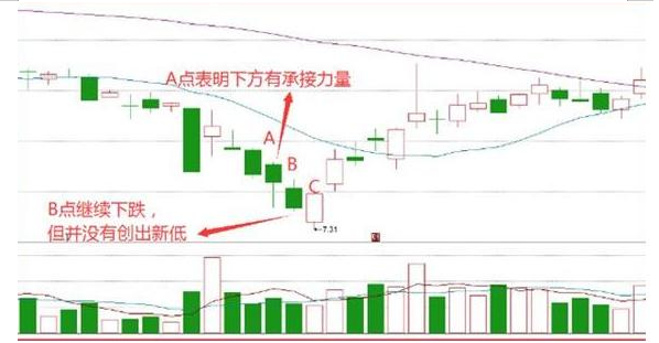我们可以看到指数经过长时间下跌之后,在A点形成一个带有长下影线的个股,第二天继续走下跌之路,但是我们可以看到指数并没有创出新低,说明这个地方是存在一定的资金承接,随着第三天C点出现,我们发现其收盘价已经几乎到B点的开盘价附近,形成阳包阴行情,随后的带量跳空高开就是止跌上涨行情的出现。