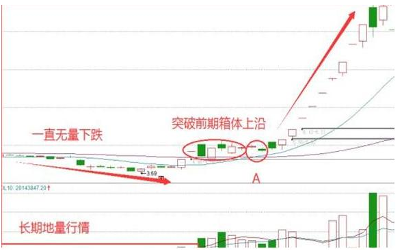 我们可看到该股前期经历较大市场的下跌行情,下方的量能是长时期处于地量行情,个股在出现无量空跌以后,慢慢出现止跌企稳的现象,其中13日均线由下跌趋势到走平,但是我们观察到下方的量能并没有明显变化,因此这是我们应该按兵不动继续观察,随着量能的突然堆积放大,指数也一直保持在13日均线上方运行,当13日均线和55日均线构成金叉,同时我们看到A点回踩两条均线的交叉为并没有跌破,就是一个适合进场的好时机。