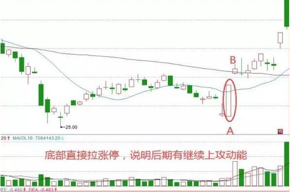 我们可以看到,在A点出现之前,指数虽然是有过一波反弹,但是力度有限,并且下方的量能也没有出现明显放大的现象,因此这时候我们不应该去盲目追涨,当指数再次回落下来之后很多人就认为这一波行情已经结束,或者有继续探底行情。从图中我们看到在A点出现的前一天,指数是形成一个跳空低开的行情,虽然盘中有拉升动作,但却被打压下来,随后第二天的再次低开已经极大的加剧了股民的恐慌心理,因此这时候很多人选择抛盘,而庄家则是直接在低位捡便宜的筹码,随后当天直接拉涨停,这个动作非常干脆,随着第二天B点的跳空高开,直接站上低位高点上方,就是一种新一轮行情的开启信号。