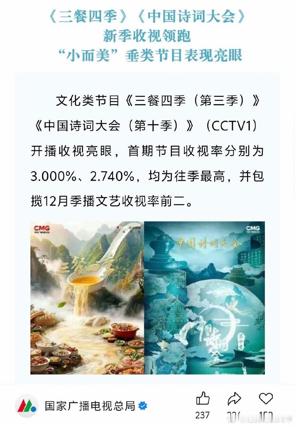 内娱美食综艺有自己的熹妃回宫 内娱美食综天花板非《三餐四季》莫属!从2.963%到破3%的收视飞跃,堪称“熹妃回宫”级强势。四川篇的热辣风味+明星趣味互动,烟火暖食治愈所有疲惫~