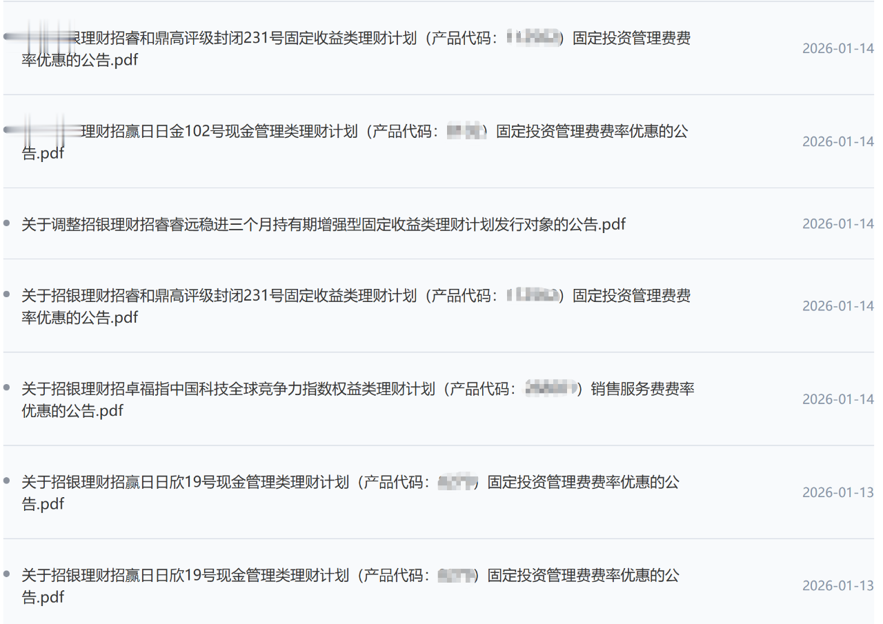 1月14日,招银理财发布多条费率优惠公告,其中“招睿和鼎高评级封闭231号产品”固定投资管理费率由0.15%降至0.01%。此前一天,招银理财发布公告称,对多只产品给予阶段性费率优惠,固定投资管理费率调整为0。