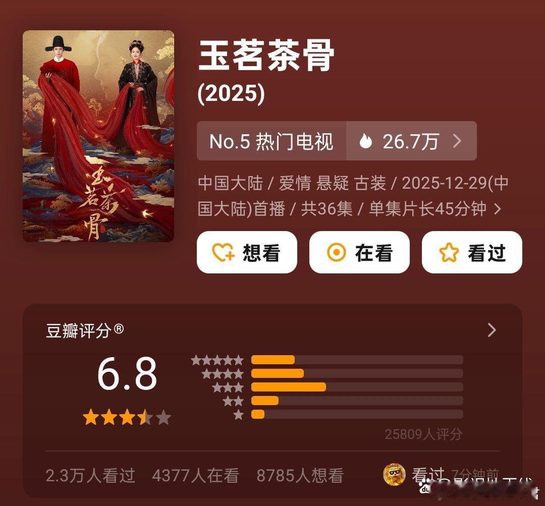 有两部剧豆瓣开分了,分别是古力娜扎《玉茗茶骨》6.8分,罗云熙《剥茧》6.6分。