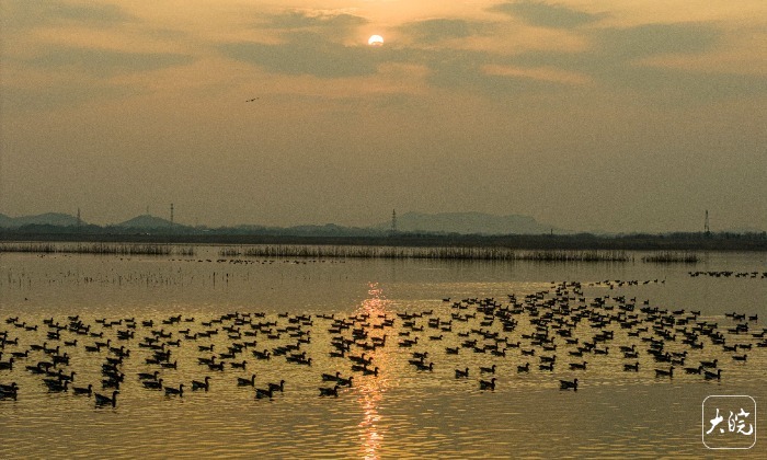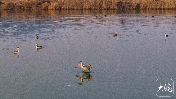 大皖新闻讯1月16日,在合肥市庐江县黄陂湖湿地,一大群凤头䴙䴘(pìtī)与白天鹅、赤麻鸭等一批珍稀候鸟在湖中尽情嬉戏、觅食,在冬日暖阳下呈现出一幅自然和谐的生态画卷。