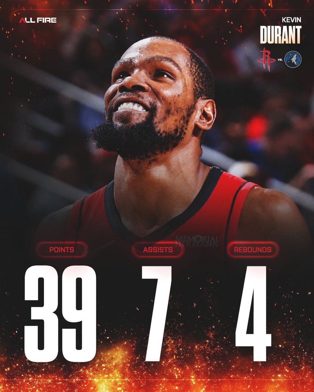 赛后,火箭社媒分享杜兰特&申京海报:杜兰特和申京带领我们主场获胜。