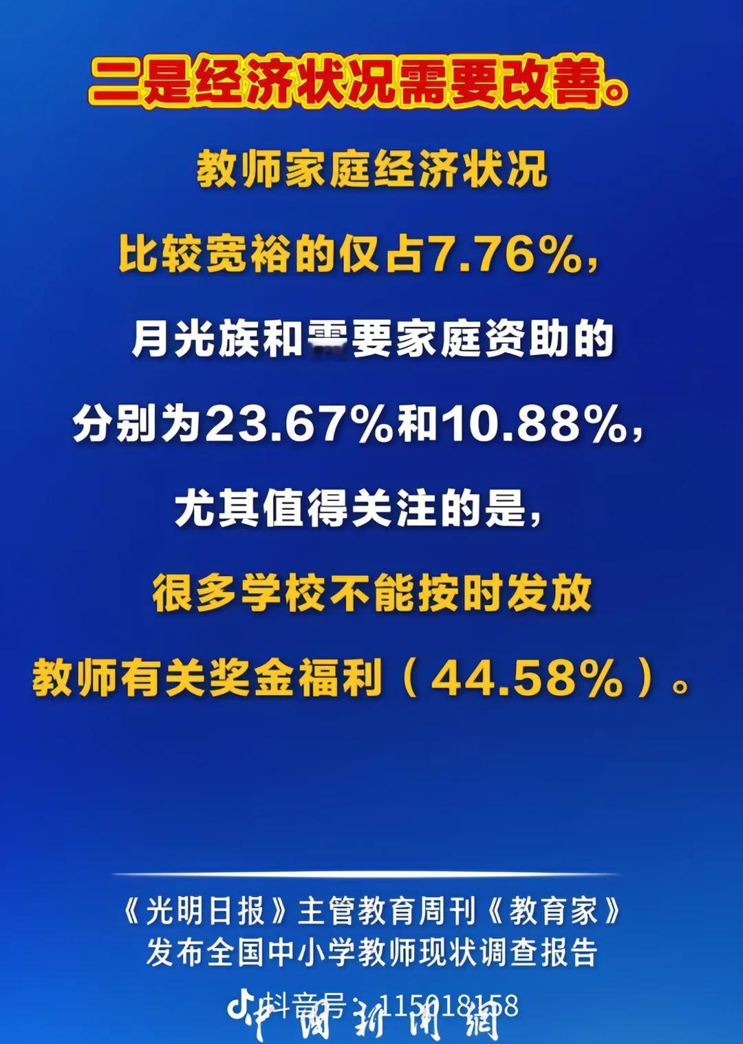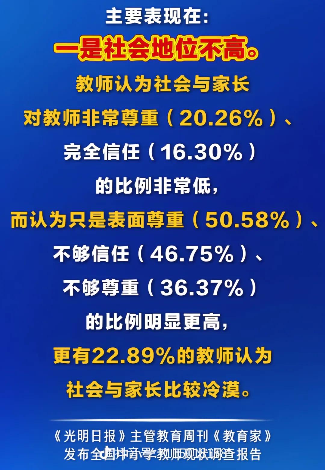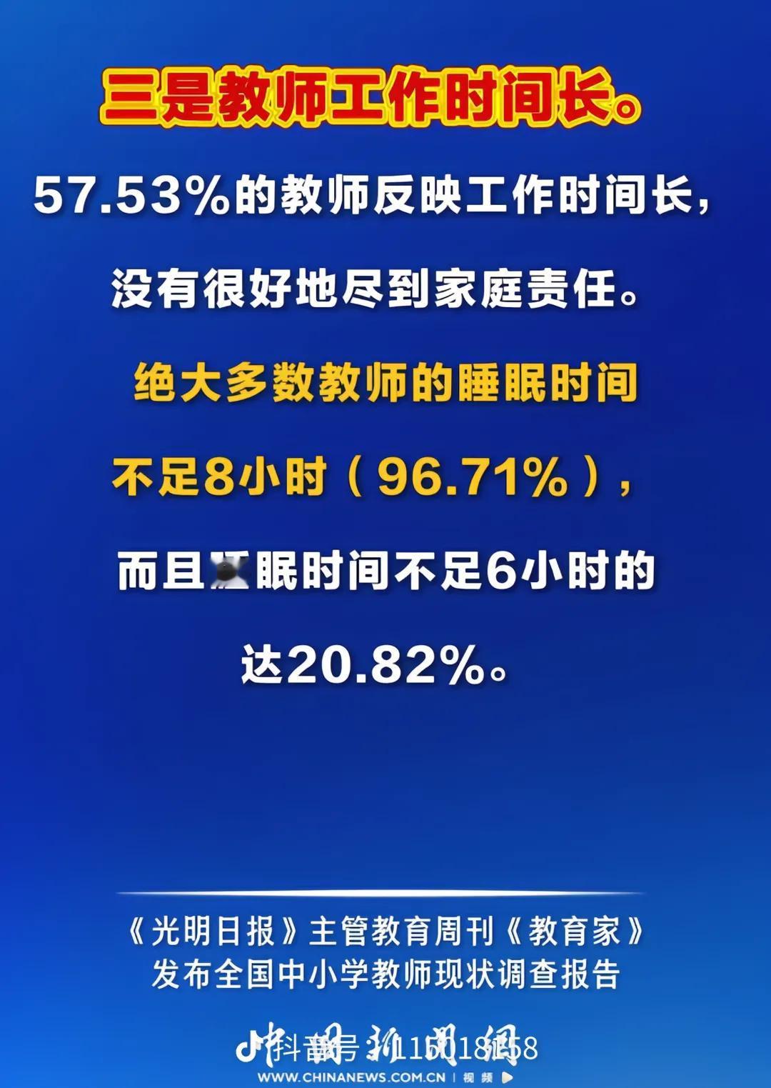 教师的命也是命,他们的现状令人堪忧! 根据最新发布的《全国中小学教师现状调查报告》,我们能够发现教师们的生活状况不尽人意,甚至可以说十分糟糕,为何?主要表现有三方面:社会地位不高,收入水平低,工作强度大。 其中收入和工作强度方面,是最让教师们恼火的,普通教师一个月工资小几千块,小县城两三千都是常事,工资低也就罢了,近几年地方政府多次拖欠教师工资发放,让本就捉襟见肘的教师家庭更加雪上加霜,真的很难! 由于教师职业的特殊性,他们的工作强度较大,时间较长,这一块在初高中教师体现的尤为明显,睡觉时间少,绝大数教师的睡眠时间是不足7小时,陪伴时间少,教师的工作重心在学生和教学上,导致未能很好尽到家庭责任,这很令人窒息! 多点关心,多点爱,给奋斗在一线的老师们加油!