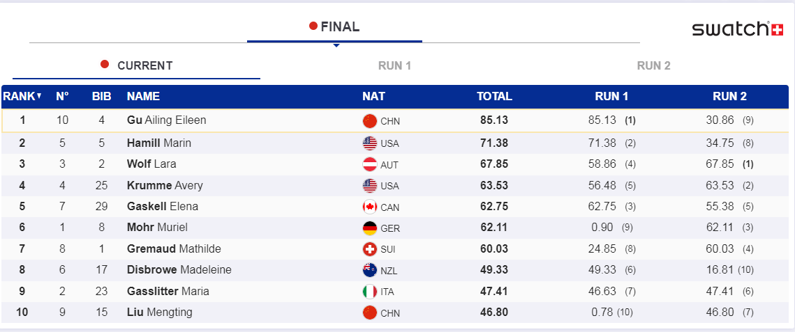 第二轮,主要竞争对手相继出现失误,倒数第二个出场的刘梦婷滑出46.80分,锁定冠军的谷爱凌滑行中出现摔倒仍获得冠军。