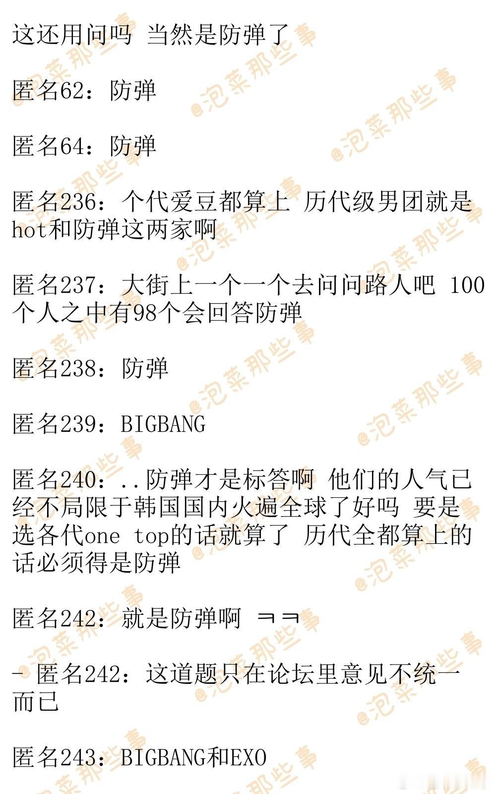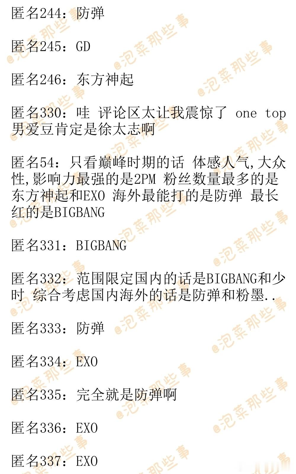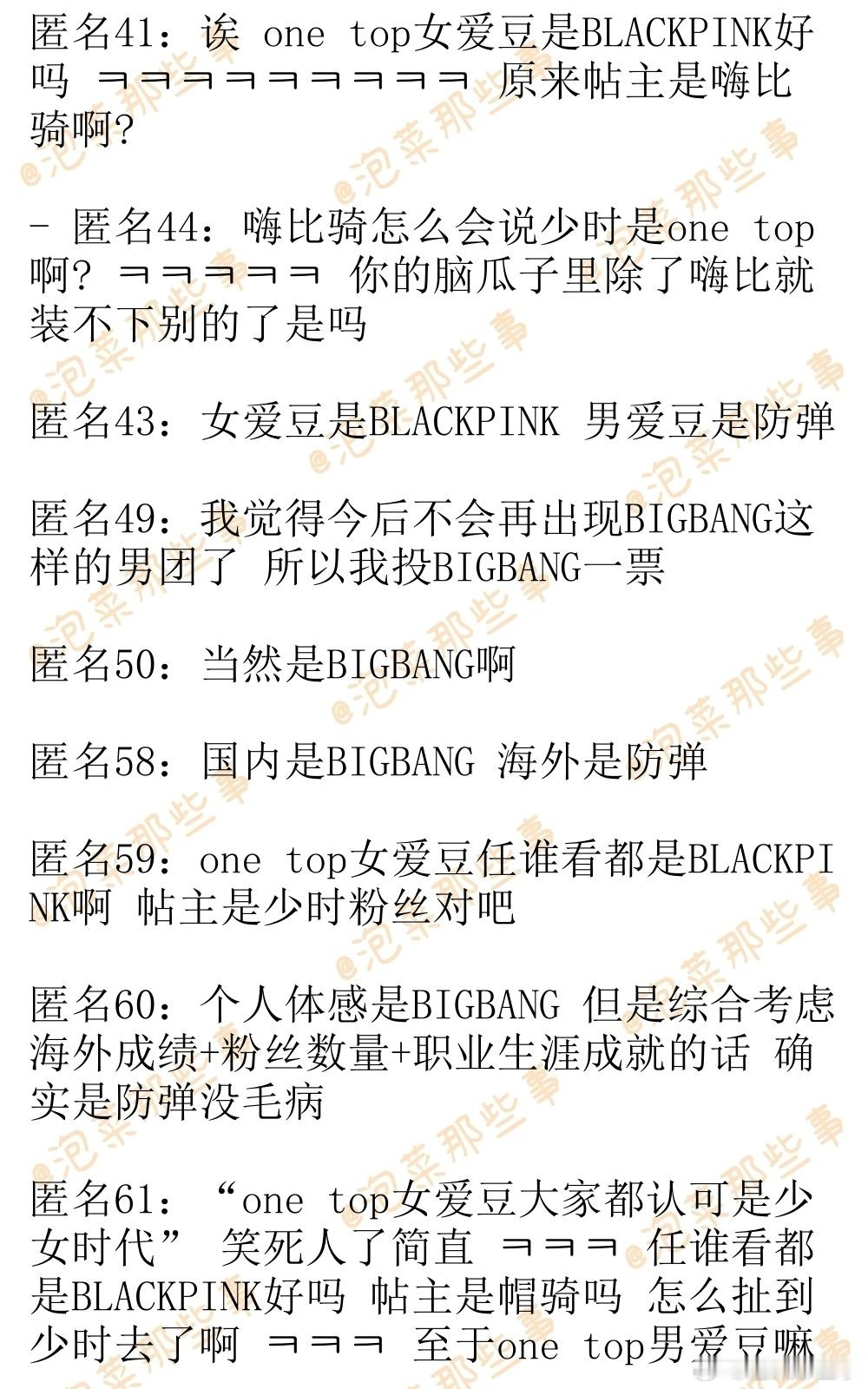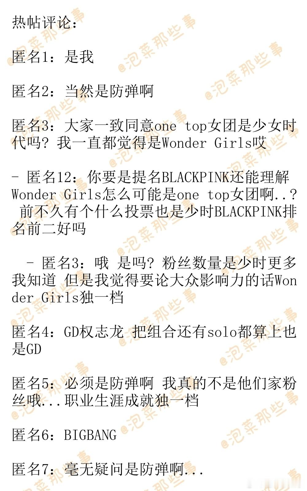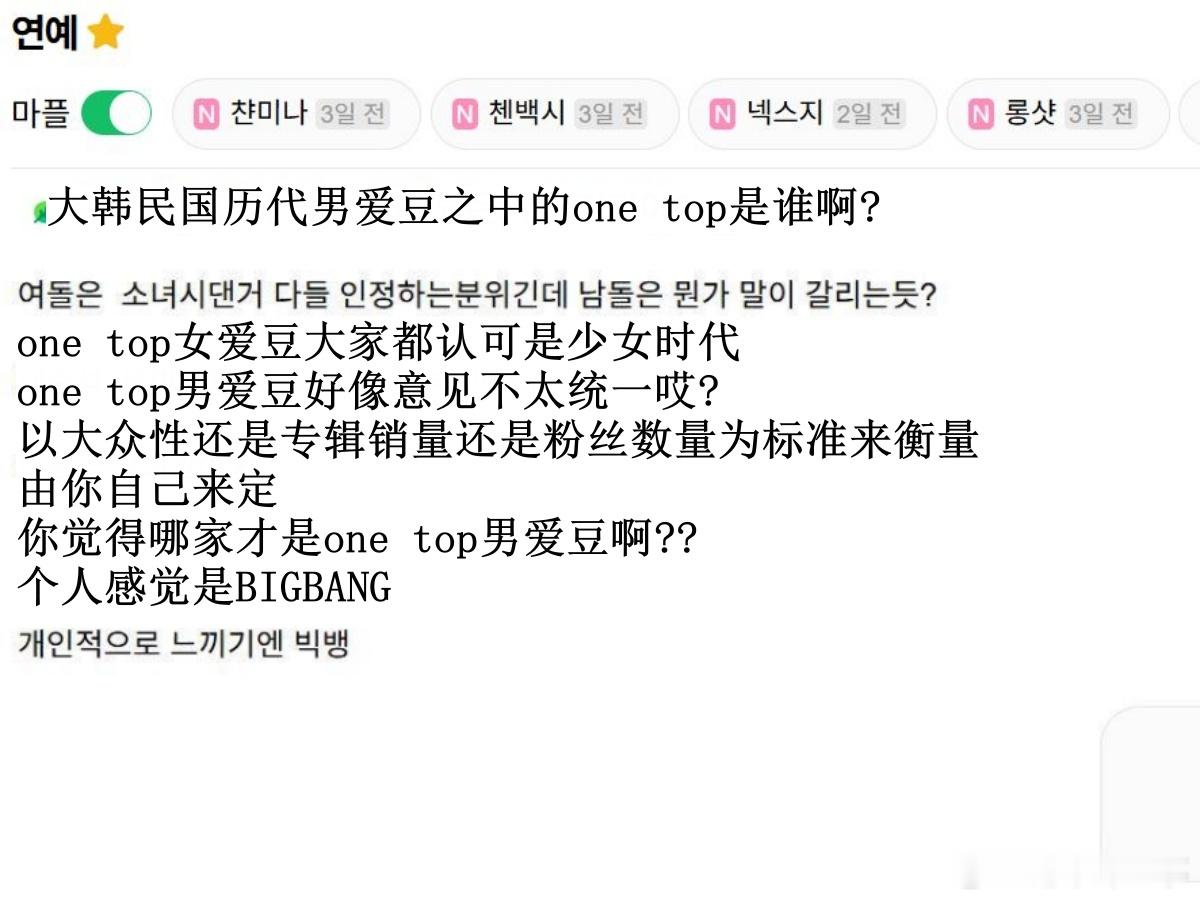 🔥韩网热帖评论翻译🔥 韩国历代男爱豆之中的one top是谁啊?韩网原帖帖主发问:大韩民国历代男爱豆之中的one top是谁啊? one top女爱豆大家都认可是少女时代 one top男爱豆好像意见不太统一哎? 以大众性,专辑销量,粉丝数量等标准来衡量 你觉得哪家才是one top男爱豆啊?? 个人感觉是BIGBANGcr.instiz