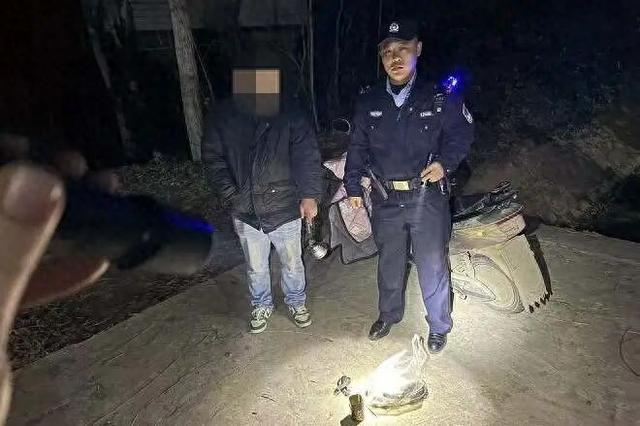当晚,巡逻民警行至岔路镇周店村一路段时,发现一名男子头戴照明灯在树林边照射,形迹可疑。民警随即上前盘查,发现该男子刘某手持弹弓,疑似正在捕鸟。