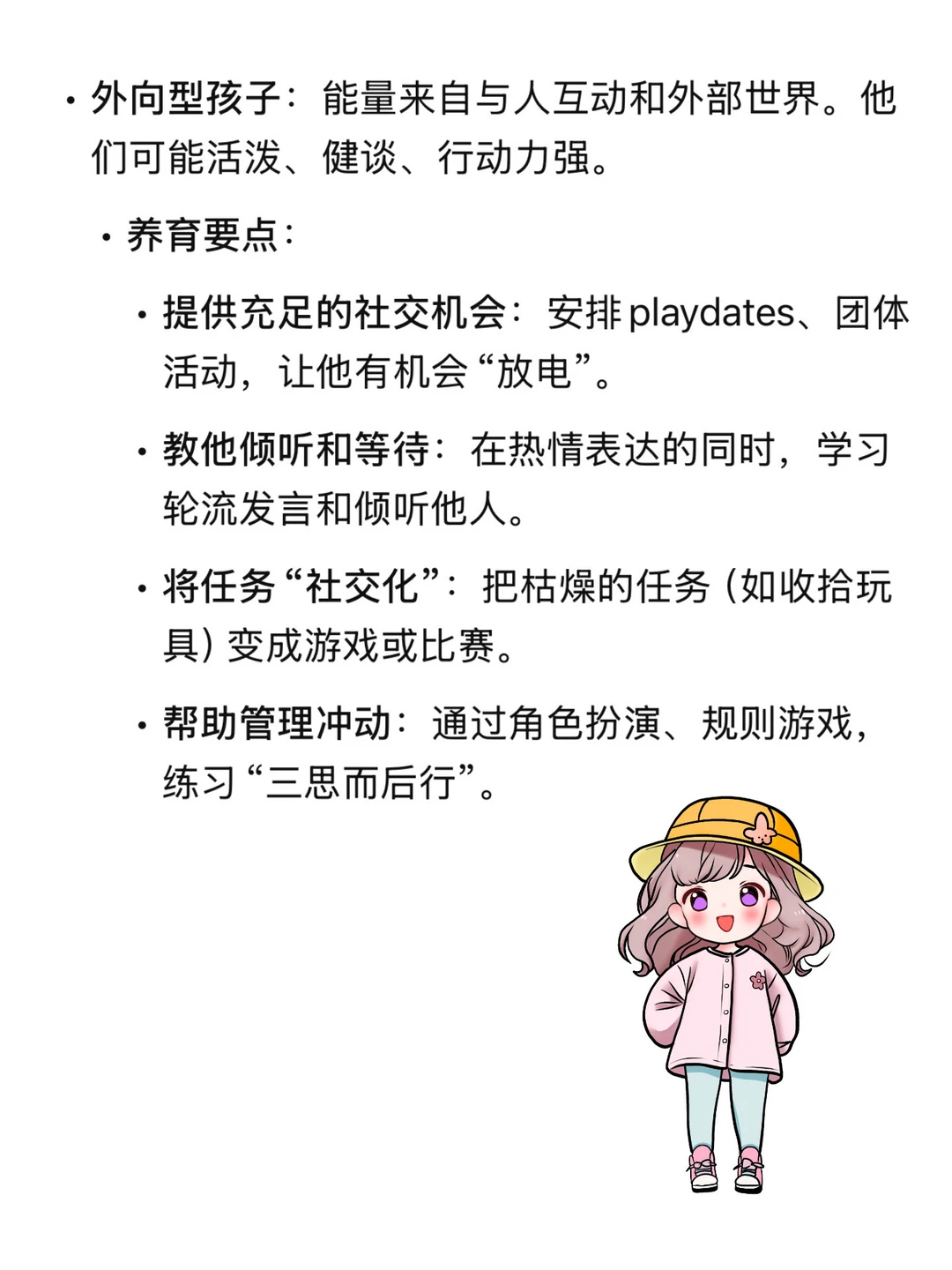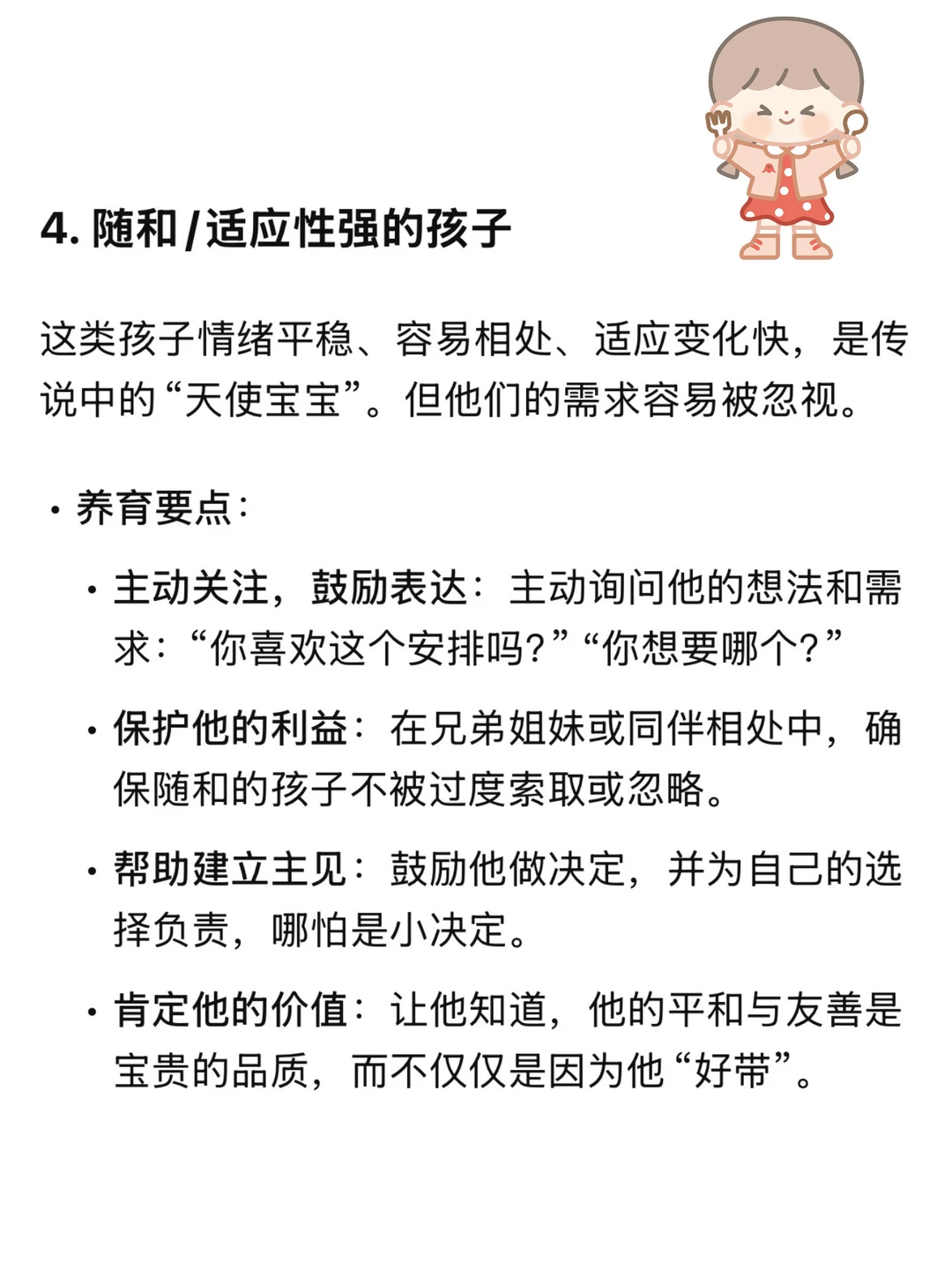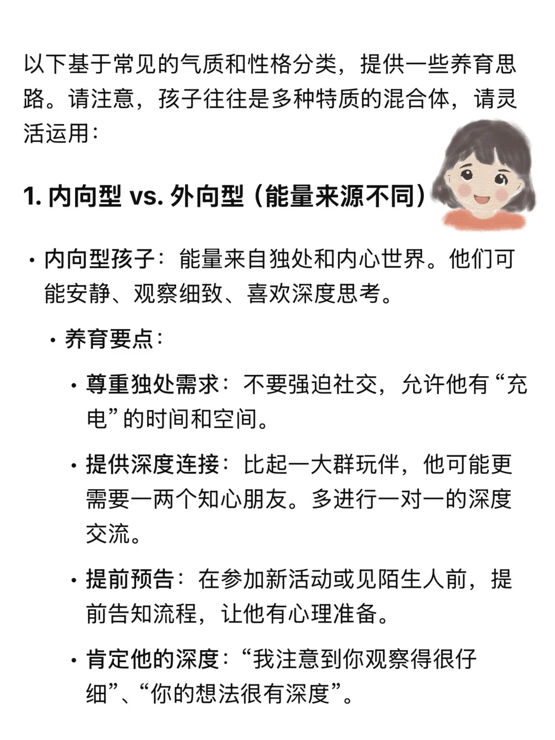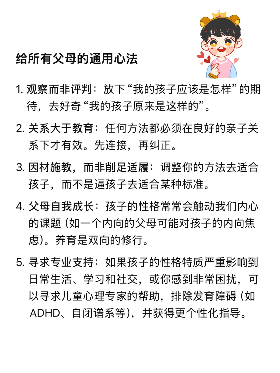这是一个非常重要且深刻的问题,每个孩子都是独一无藏的。养育孩子不是寻找一本通用的“说明书”,而是成为发现孩子内在特质的“园丁”。 核心原则是:接纳是改变的起点,顺应才能更好地引导。 教育的目标不是把内向变外向,而是帮助孩子发展出基于其天性的、适应社会的健康人格。 以上基于常见的气质和性格分类,提供一些养育思路。请注意,孩子往往是多种特质的混合体,请灵活运用~