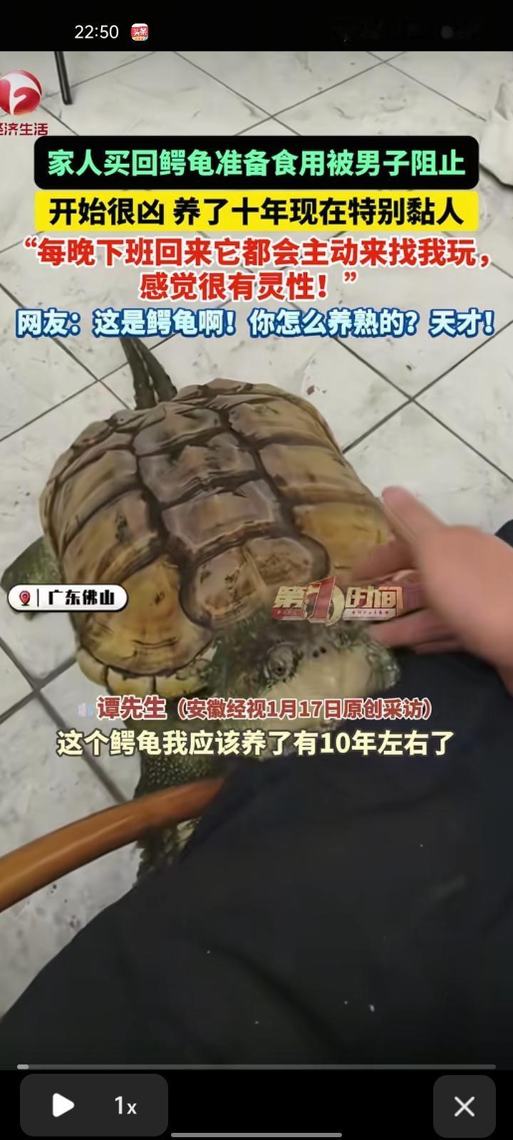 1月17日,广东佛山。家人买回鳄龟准备食用时被男子制止,刚开始养鳄龟时它很凶猛,养不熟会咬人,养了十年就特别粘人了。 当事人谭先生介绍,天气暖和时,这只雄性鳄龟会在自己的客厅里玩,口渴了或者玩累了它就会自己爬会箱子喝水休息。