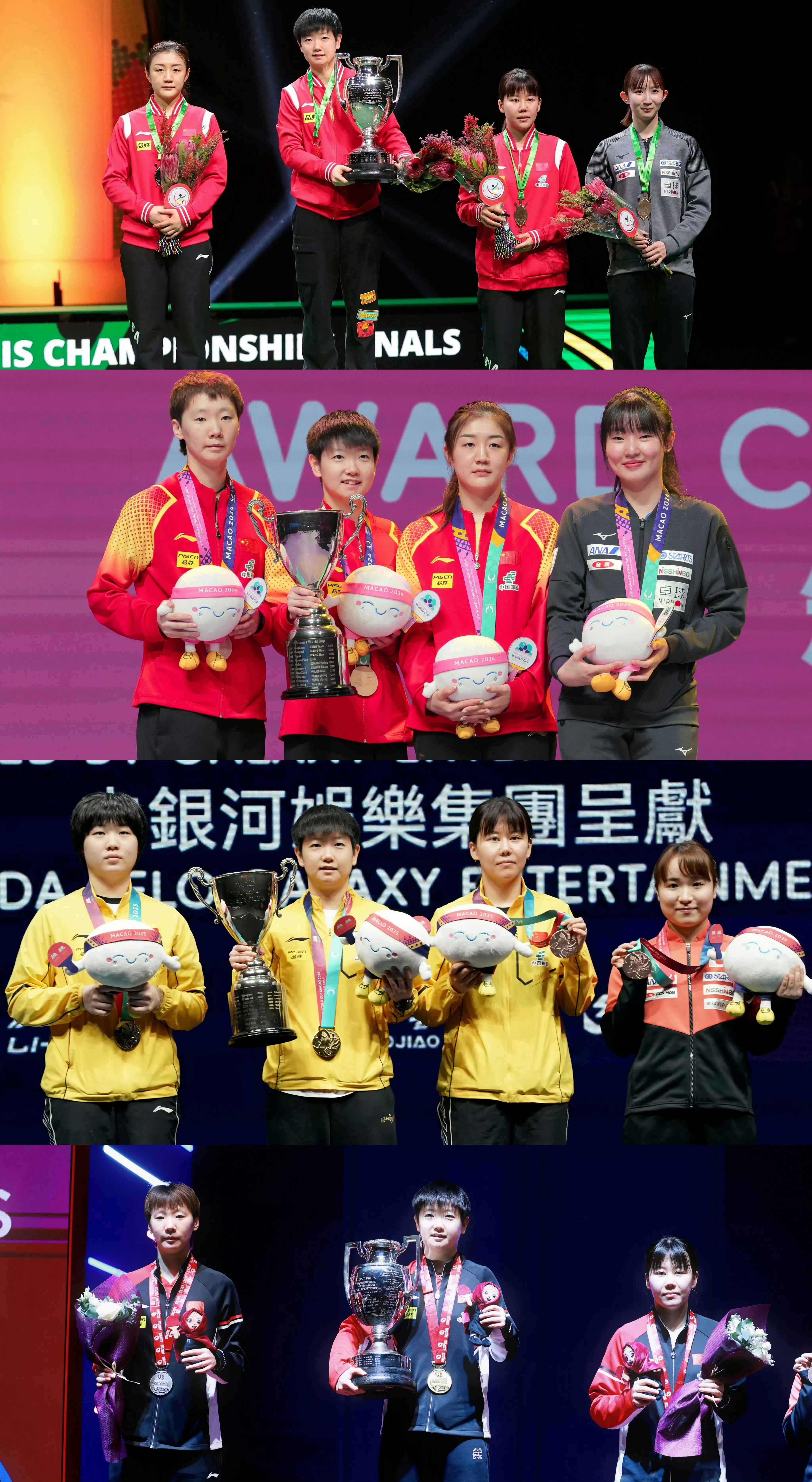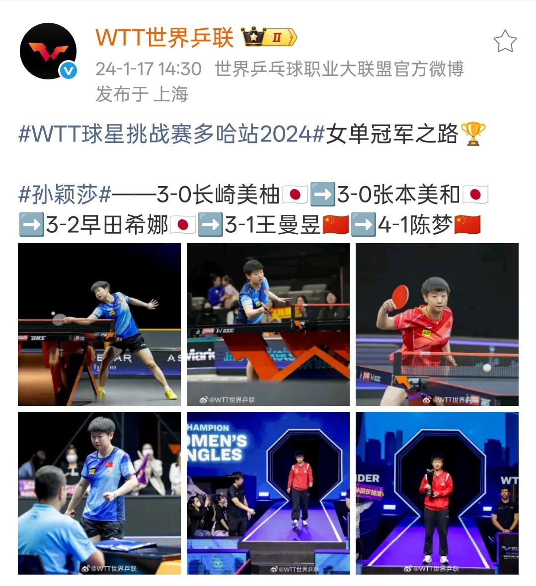 孙颖莎 2024多哈球星挑战赛孙颖莎一串三日女——长崎美柚 张本美和 早田希娜,半决赛决赛一串二连胜王曼昱、陈梦两位绝对主力夺冠🏆2025多哈世乒赛孙颖莎参赛项目夺冠率100%,世乒赛女单战胜队友王曼昱成功卫冕,35天内成就世界杯世乒赛双卫冕冠军、女乒历史唯一世乒赛双圈金满贯🏆