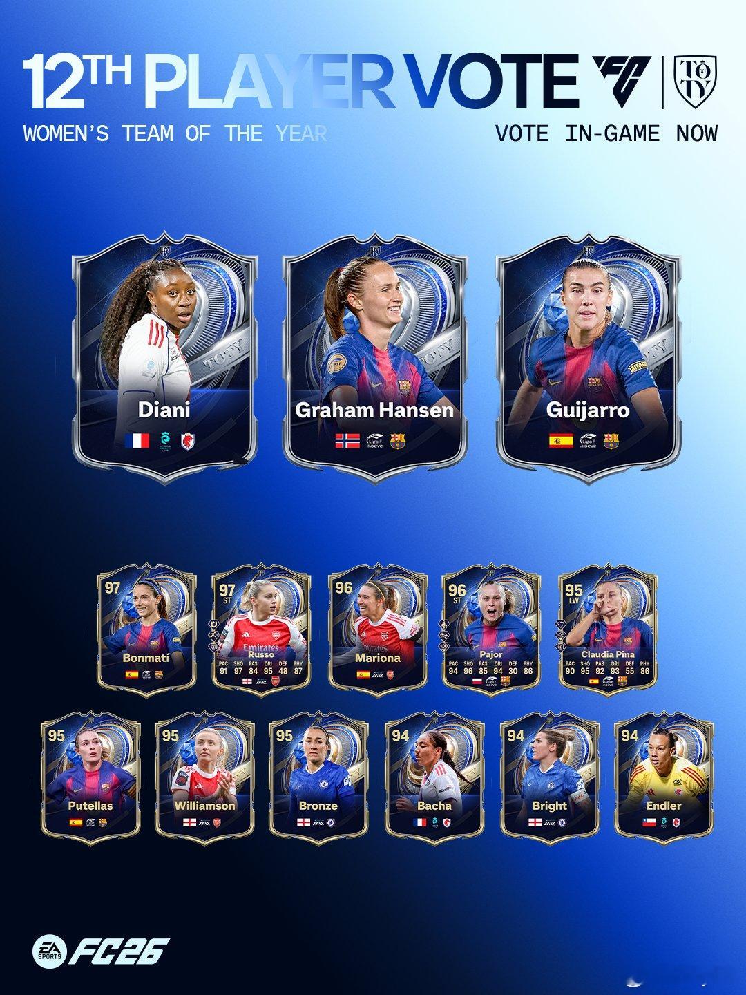 Team of the Year年度最佳第十二人票选开启。大家在游戏中会收到2个球员挑选包,可通过此挑选包为喜欢的球员进行投票。FC26