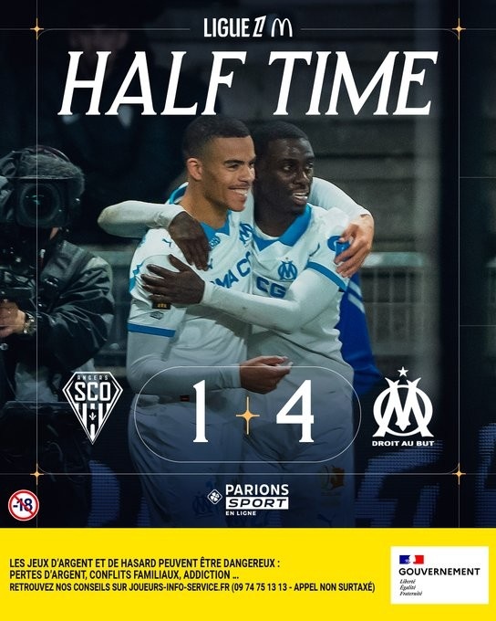直播吧1月18日讯本轮法甲焦点战,马赛客场4-1领先昂热,球队在前40分钟便打进4球。