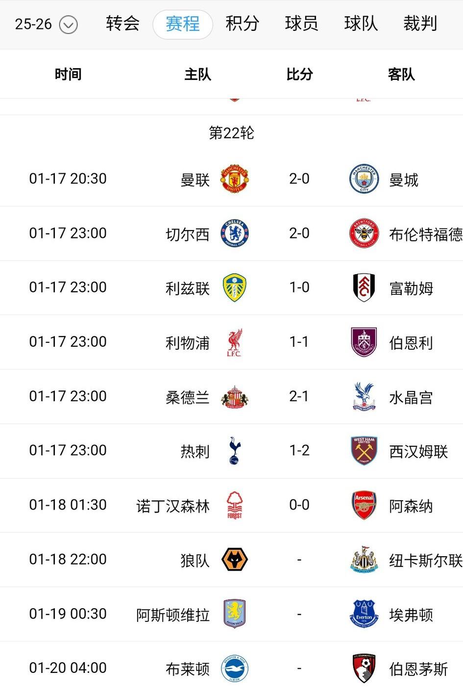 疯狂英超,强队是不是进入疲惫期?阿森纳不胜、曼城利物浦都不胜!如果明天维拉取胜,跟榜首差距将缩小到4分。 曼城进入2026年,联赛一场都未取胜。 曼联换帅如换刀,主场2-0击败曼城。 切尔西终于收获了一场难得的胜利,排名回到了第6。 热刺被降级区球队绝杀,西汉姆联缩小差距。伯恩利输球深陷降级区。 利兹联1-0险胜富勒姆,拉大跟降级区距离,保级无忧了。