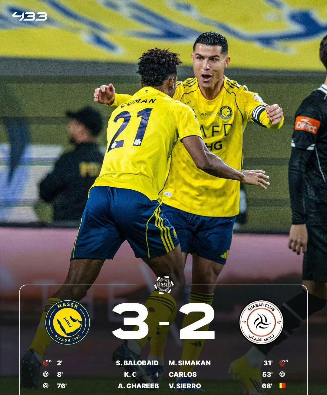 利雅得胜利3-2利雅得青年人。利雅得胜利终结4连败拿下三分,排名升至第二。 罗哥