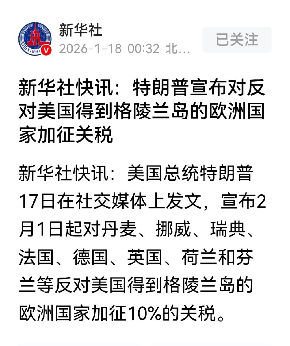 这霸权操作简直没谁了!特朗普用关税大棒抡向欧洲盟友,完美诠释“顺我者昌,逆我者亡”的强权逻辑。 1月17日,他在社交平台官宣,2月1日起对反对美国获取格陵兰岛的8个欧洲国家加征10%关税,6月还将加码至25%,不买到手不罢休。要知道格陵兰岛是丹麦自治领地,欧洲多国明确反对这种“强买强卖”,却遭无情报复。 一边觊觎北极战略要地,一边拿盟友开刀,这种单边施压看似强硬,实则在撕裂跨大西洋信任。盟友不是任人拿捏的棋子,霸权主义的算盘,终究会因失道寡助而落空。