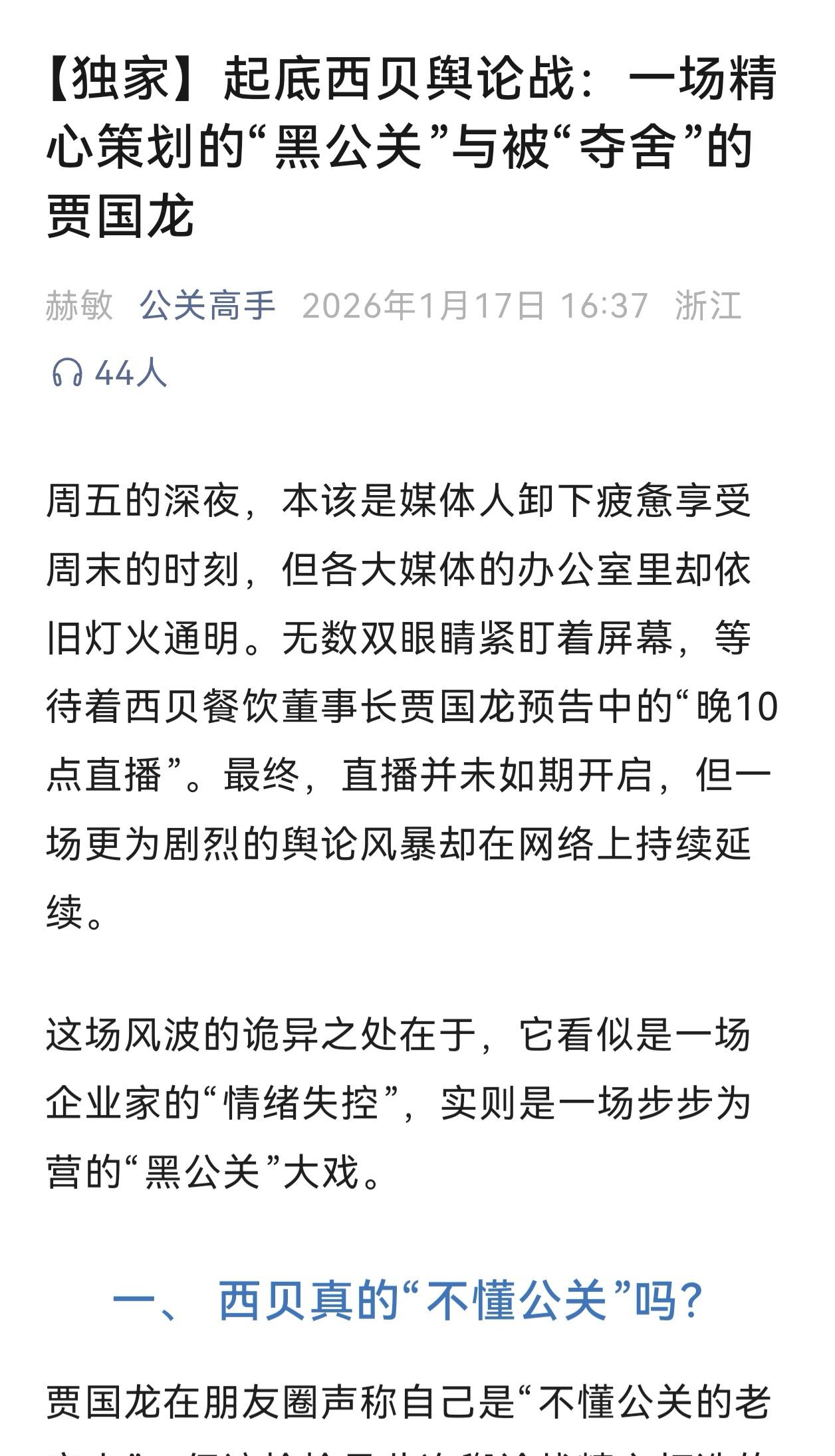 越来越有意思了,罗永浩的交个朋友公司公关副总裁吴加录,亲自下场了,说贾国龙这次出来回应,是一场精心策划好的“黑公关”。 昨天,有一个叫公关高手的账号写了一篇文章,标题很有意思,叫《“独家起底西贝舆论战:一场精心策划的“黑公关”与被“夺舍”的贾国龙》。文章大概的意思是贾国龙这次站出来回应,是有人在背后出谋划策,是一场对罗永浩发起的黑公关,想把责任都推给罗永浩。 这个账号有人扒了一下,持有人叫吴加录,一查发现是交个朋友副总裁,负责公关业务。看起来罗永浩说不再回应了,但公司的人开始代替出手了。 昨晚,贾国龙在朋友圈又回应了,大概的意思是罗永浩污蔑西贝是预制菜,还煽动舆论攻击西贝和员工。 所以,虽然贾国龙和罗永浩的账号虽然都被禁言了,但双方的交锋还会持续,好戏还在后头。