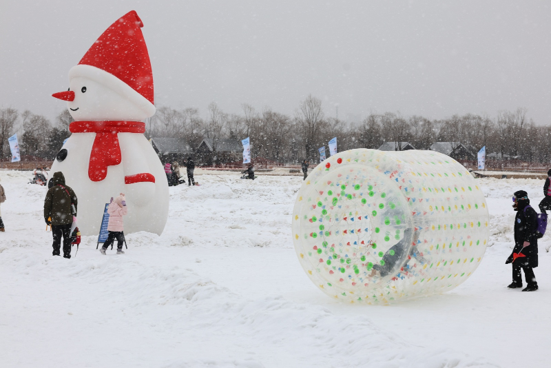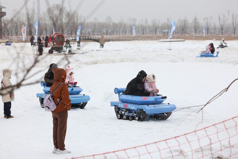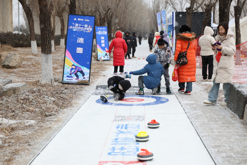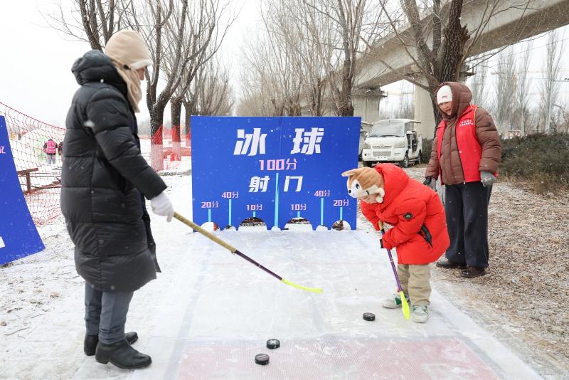 体验区内,冰蹴球、冰上保龄球、冰壶等10余项趣味冰雪项目吸引游客驻足。