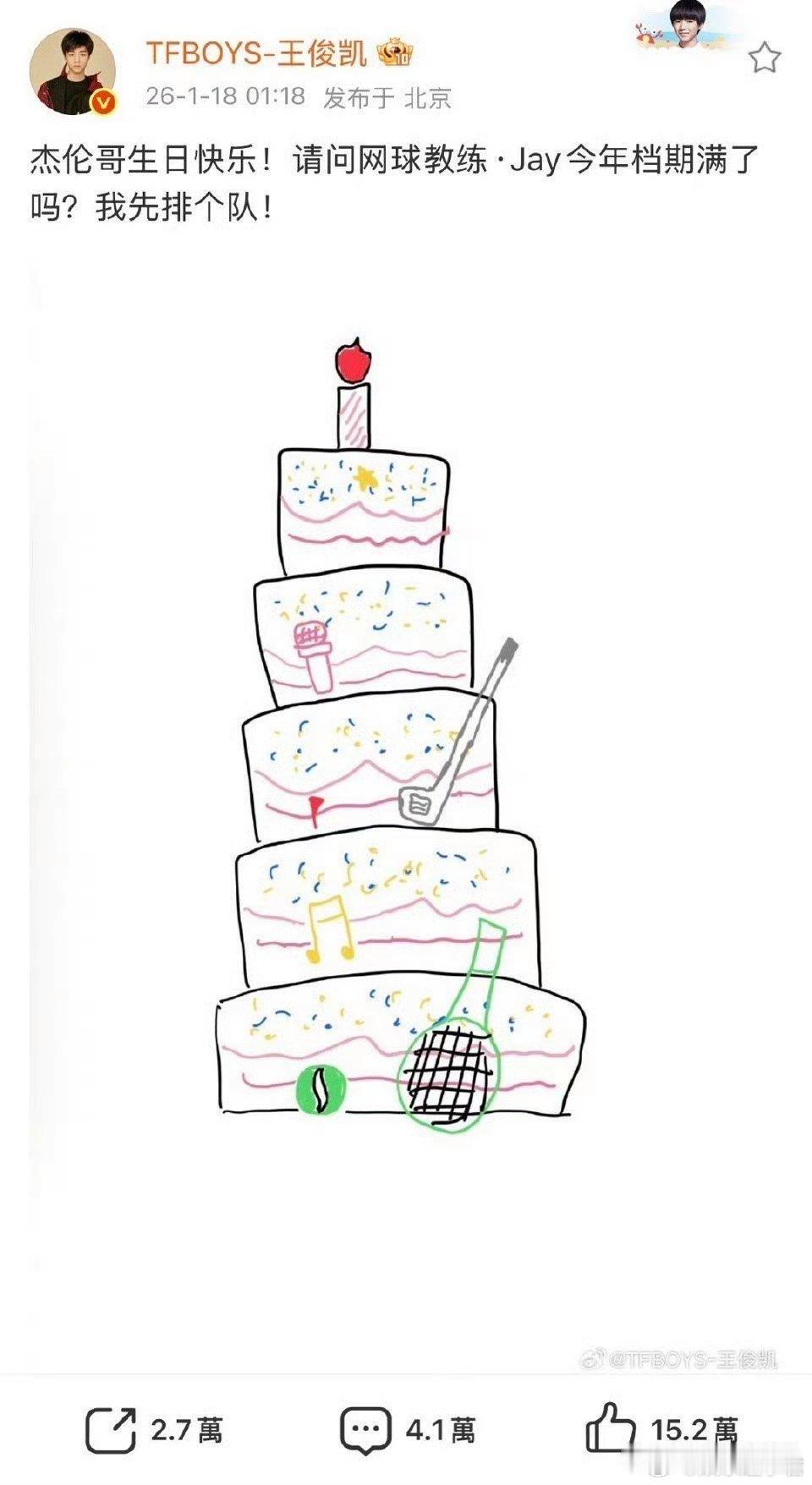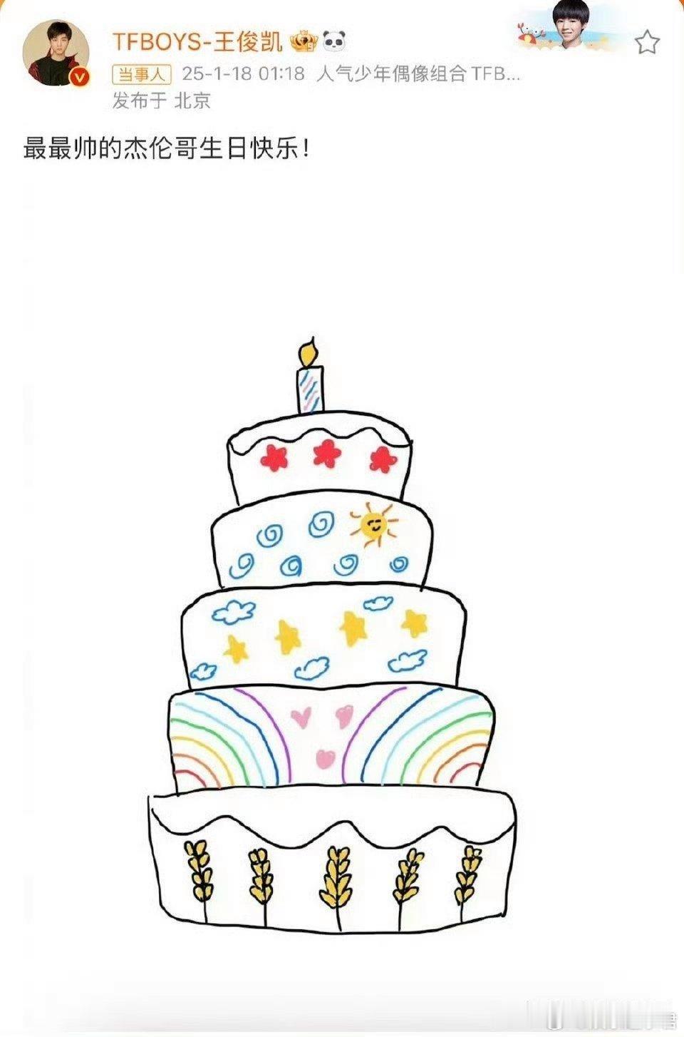 王俊凯连续11年给周杰伦庆生崇拜偶像,成为偶像,王俊凯,十一年来,一年一次的庆生打卡,记录了一个男孩和他偶像的双向奔赴,给偶像手搓的生日蛋糕都能凑九宫格了!十年多的坚持,每一款蛋糕的细节都拉满,从元素到配色全是小心思,这才是追星人该学的榜样,而且王俊凯也越来越优秀。