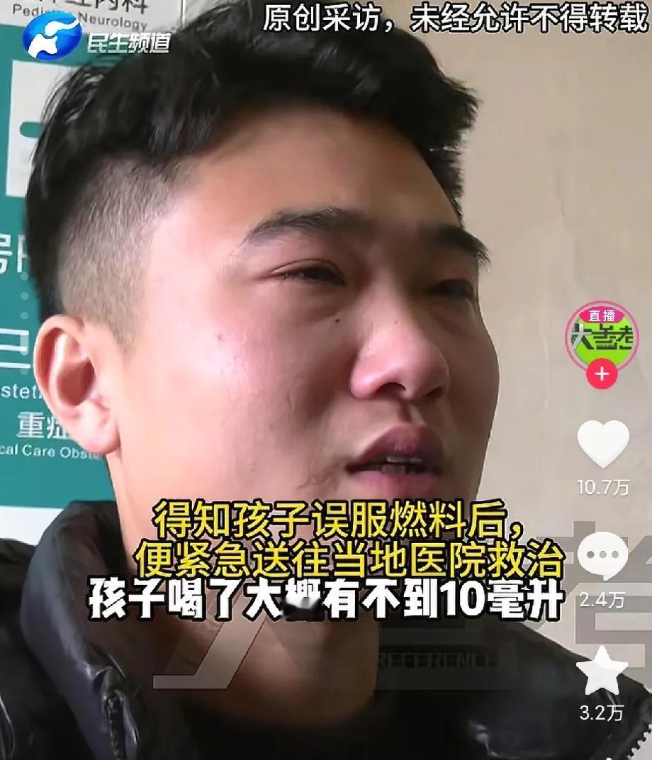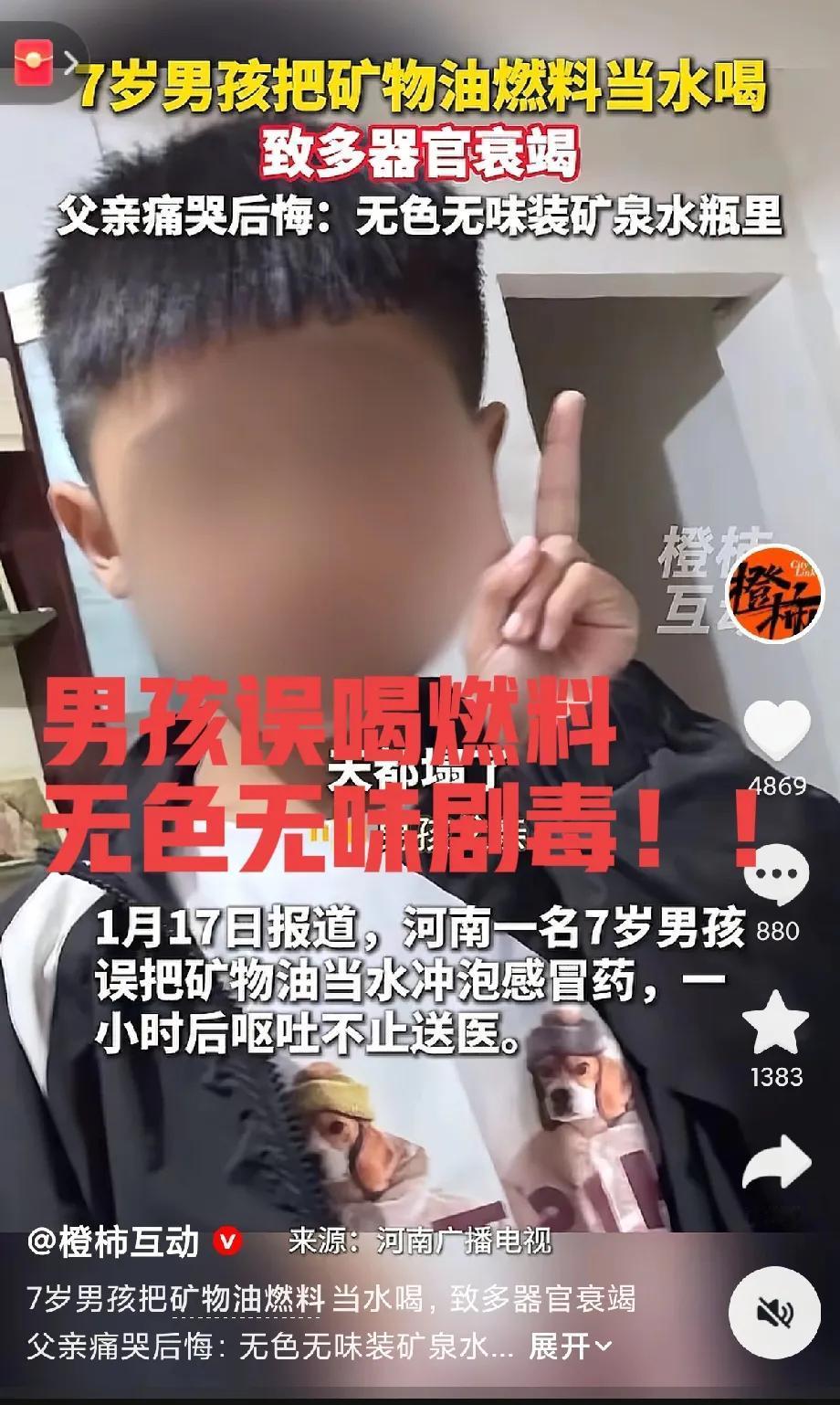天塌了!河南,7岁男孩感冒后,爷爷用矿泉水兑温水给孩子冲感冒颗粒,几小时后呕吐昏迷,谁料,给爸爸打电话得知,原来矿泉水瓶里并不是矿泉水,而是爸爸从火锅店拿回来的无色矿物油燃料。 当天家里饮水机没有水了,于是爷爷采用矿泉水兑温水给孩子冲的颗粒,小孩喝了一口后感觉不太对,就跟爷爷说了。 于是爷爷就打电话问爸爸,爸爸立马说,这是火锅燃料。 接着他们到了县人民医院,医生让洗胃,但是他们并没有洗,而是选择观察了一个小时,选择了保守治疗。 接着又到了县妇幼保健院观察了一个小时,又转到了周口。 孩子就这样被周转了几个医院,最后拖了20多个小时才开始洗胃。 小孩难受呕吐,最后晕倒,检查结果就是急性肾衰竭,肝衰竭,后来孩子病危,又转到了更大的医院进ICU了。 现在孩子已经花了6万多了,一天至少要3万。 这家人的危险意识实在是太低了,假如孩子喝下去的第一时间就抠嗓子眼催吐,然后再到医院洗胃,可能后面的一切都不会发生。 更不用提,后面还动不动就观察1小时又1小时,喝的东西全部都被吸收了,再救还能管什么用呢? 有网友就说自己家奶奶用脉动瓶装医用酒精,结果结果他开车拿着就喝了一大口,最后难受了一整天。 还有的网友感慨,这个爹真是个人才,吃个火锅还用上燃料了,大多数现在家里不都是直接用电吗? 说实话,带孩子的人都会有一种预知危险的意识。 我忘了是哪个医生说过矿泉水瓶子除了水,真的,别的什么药液体也不要装,或者开过瓶之后的不要再喝了,而且不只是小孩,大人也容易忘记这种事儿。 如果家里人用矿泉水瓶或者是什么瓶装东西,真的一定要写好标签,放在瓶身上,万万不能疏忽大意,尤其是家里并不是只有你一个人在生活。