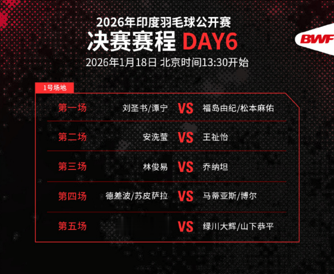 虎扑01月18日讯2026年印度羽毛球公开赛决赛迎来收官之日,王祉怡、圣坛组合和梁王组合将冲击新赛季首个750赛的冠军。首场比赛将于北京时间13:30打响。