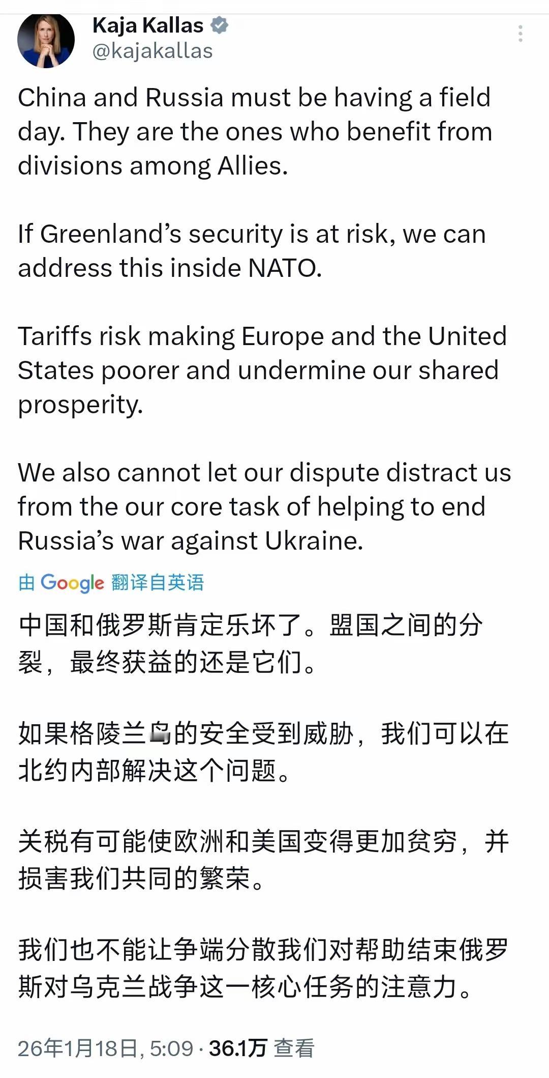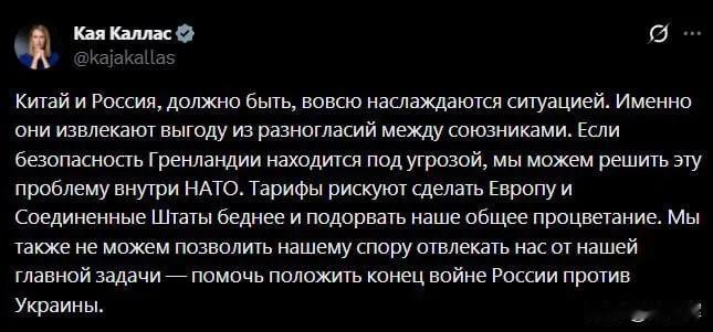 眼里只有对抗,心里全是战火!卡拉斯这位欧盟外交负责人在近日社交平台急呼美国别因格陵兰岛关税分心,赶紧聚焦俄乌冲突,还甩锅“中俄乐见欧美分裂”。可谁不知道,她才是拱火的急先锋——上任就喊着“援乌不设上限”,逼着欧盟国家掏空防空库存,甚至要建“欧洲快速反应军事联盟”,连斯洛伐克总理都忍不住公开逼宫,骂她“盲从美国、丧失独立”。更离谱的是,她早前还质疑中俄二战贡献,给中方贴“反西方”标签,满脑子冷战对抗。 一边煽动阵营对立,一边无视欧盟内部撕裂,自己都快保不住职务了,还一门心思挑动冲突。这种把欧洲利益绑在战车上的好战逻辑,说到底不过是霸权依附下的偏执,最终只会让欧盟越陷越深。 信息源:欧盟外交与安全政策高级代表卡拉斯社交平台X账号发文、腾讯新闻、环球时报
