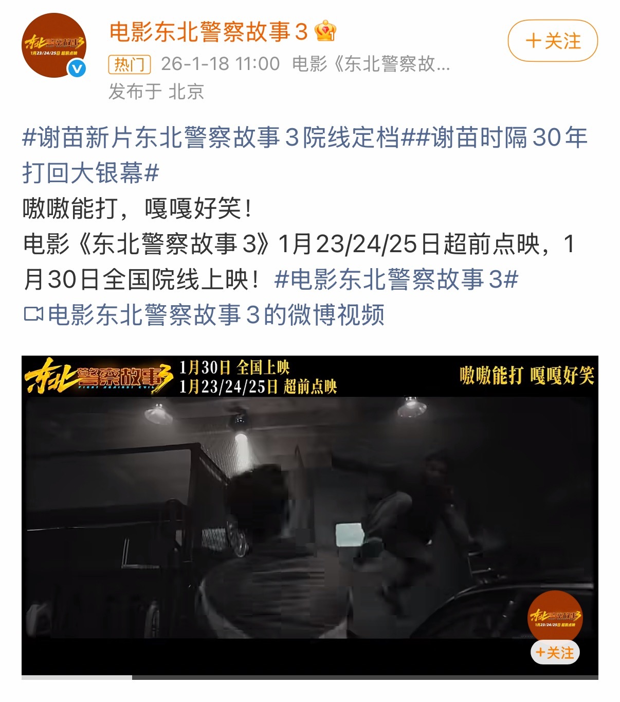 电影《东北警察故事3》院线定档1月30日上映,主演谢苗时隔30年终于打回大银幕,
