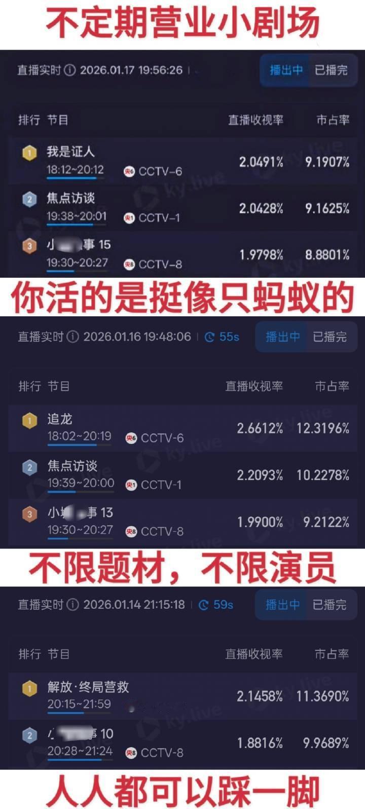 哈哈哈哈哈哈哈哈哈哈我真的笑不活了,才发现六公主两次播杨幂演的电影,小城大扑两次都跌破2,这要是央一也播剧,水城可咋整啊