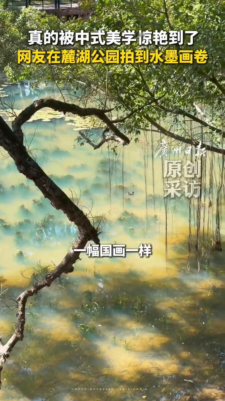 真的被中式美学惊艳到了,网友在麓湖公园拍到水墨画卷。 广州日报。 近日广州麓湖公园,上次看到这个机位的时候感觉真的很好看很震惊,刚好有一只鸭子游过去,整个画面就活起来了,看起来就会像一幅国画一样。 来源:广州日报、@小鑫摄影日记(转载已获授权)。剪辑:陆凯声。