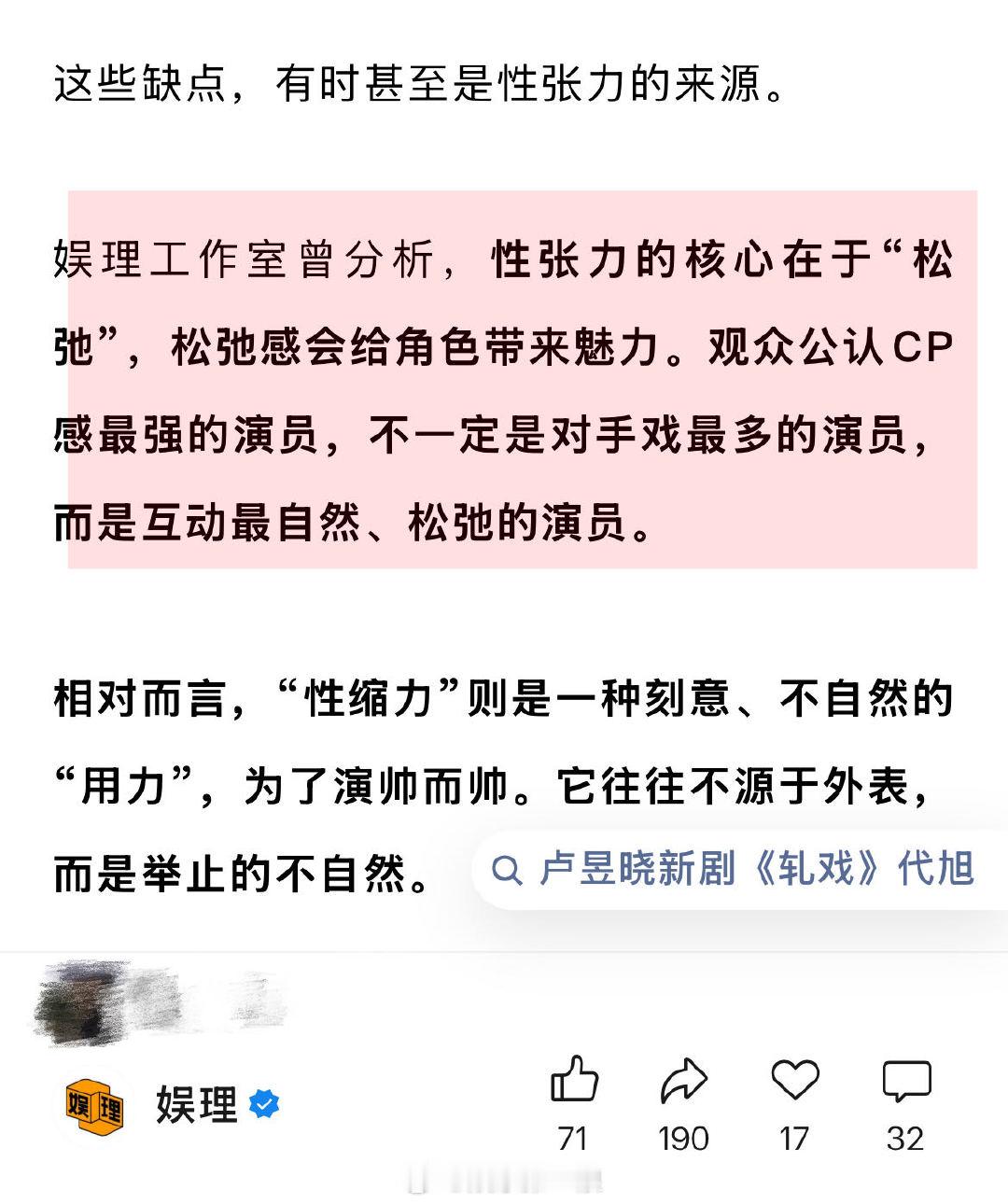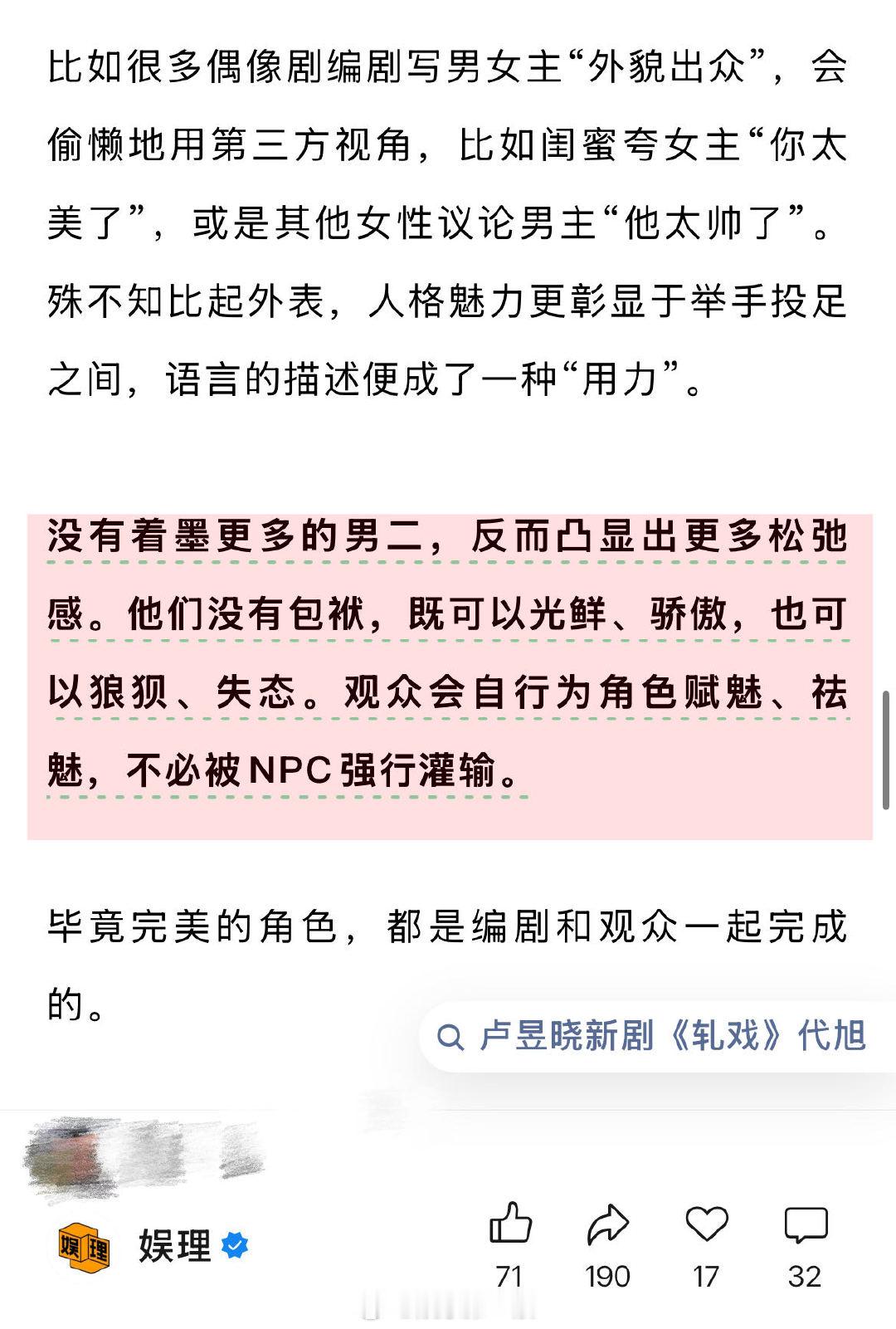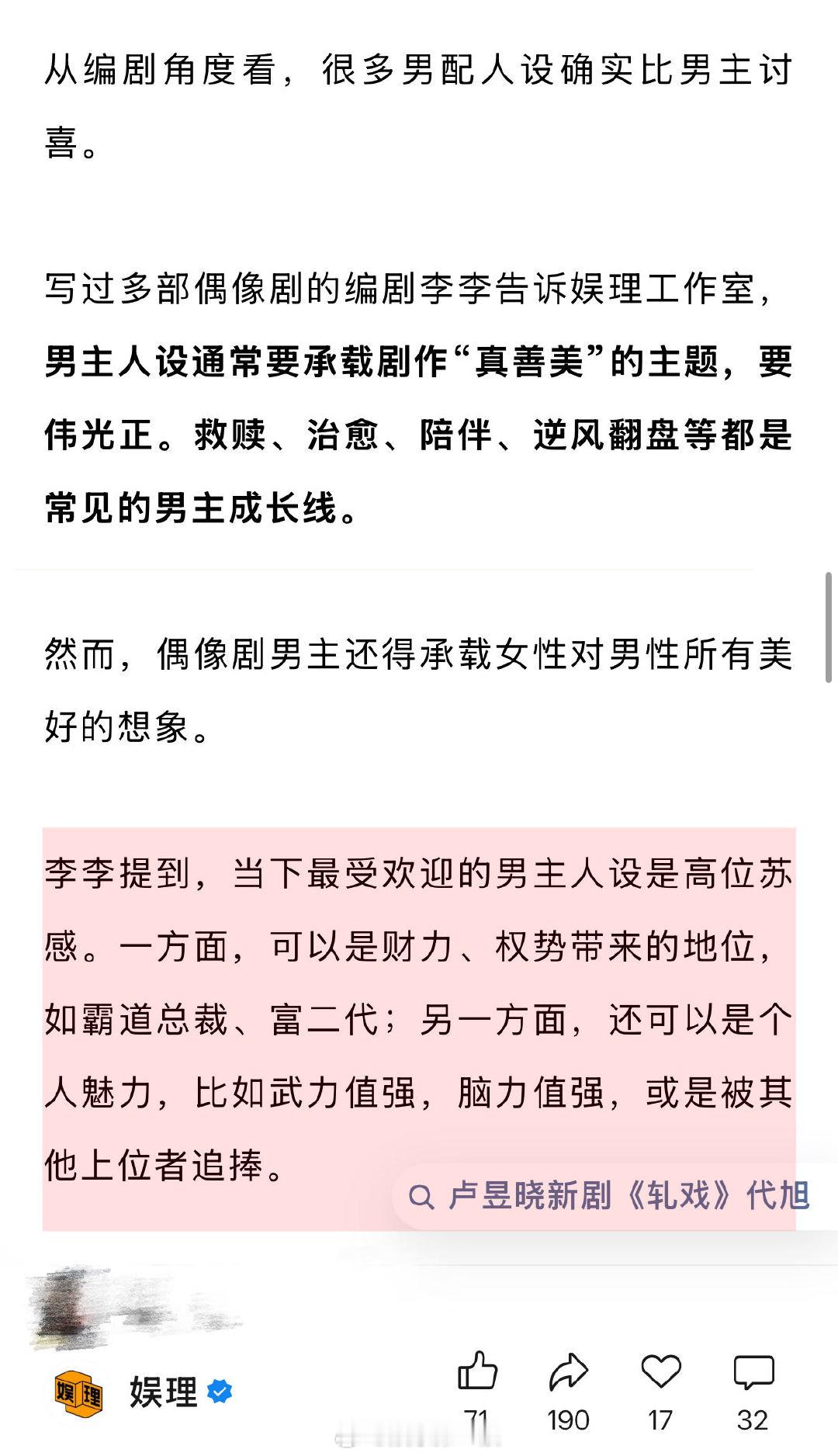 业内谈代旭走红上桌 编剧称很多男配人设比男主讨喜 从编剧角度看,很多男配人设确实比男主讨喜。某偶像剧编剧称男主人设通常要承载剧作“真善美”的主题,要伟光正。当下最受欢迎的男主人设是高位苏感。一方面,可以是财力、权势带来的地位,如霸道总裁、富二代;另一方面,还可以是个人魅力,比如武力值强,脑力值强,或是被其他上位者追捧。娱理独家↓
