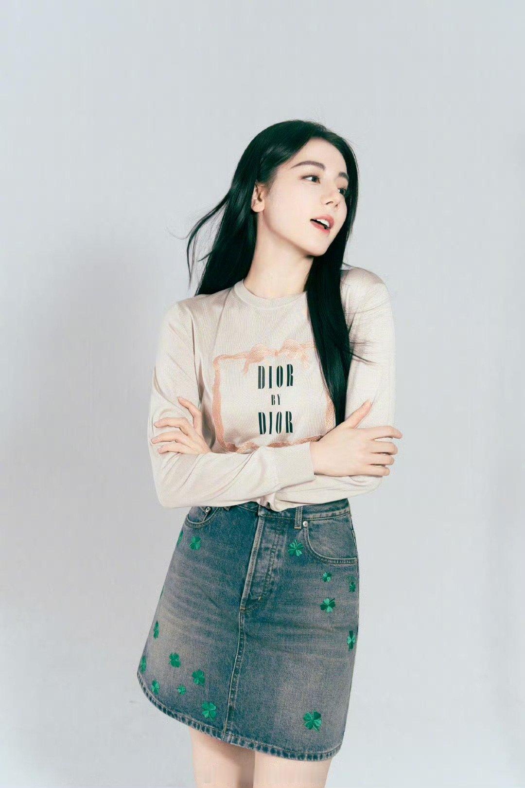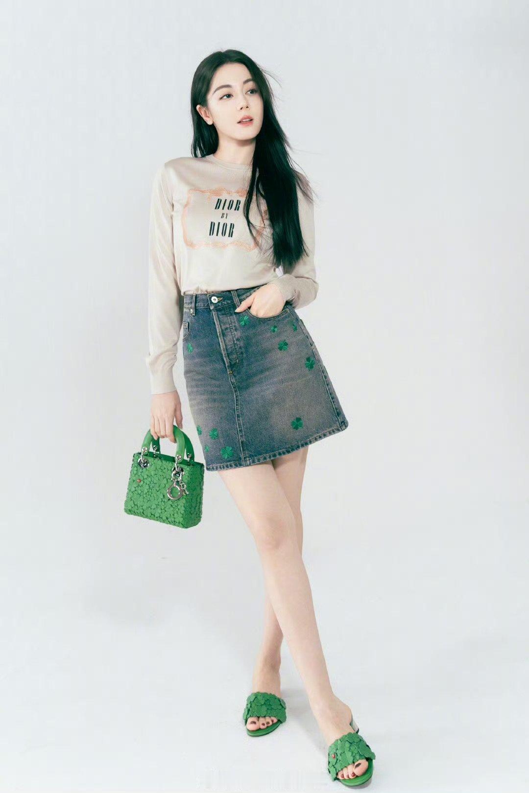 迪丽热巴好运派送成功迪丽热巴绿花牛仔短裙好漂亮的迪丽热巴