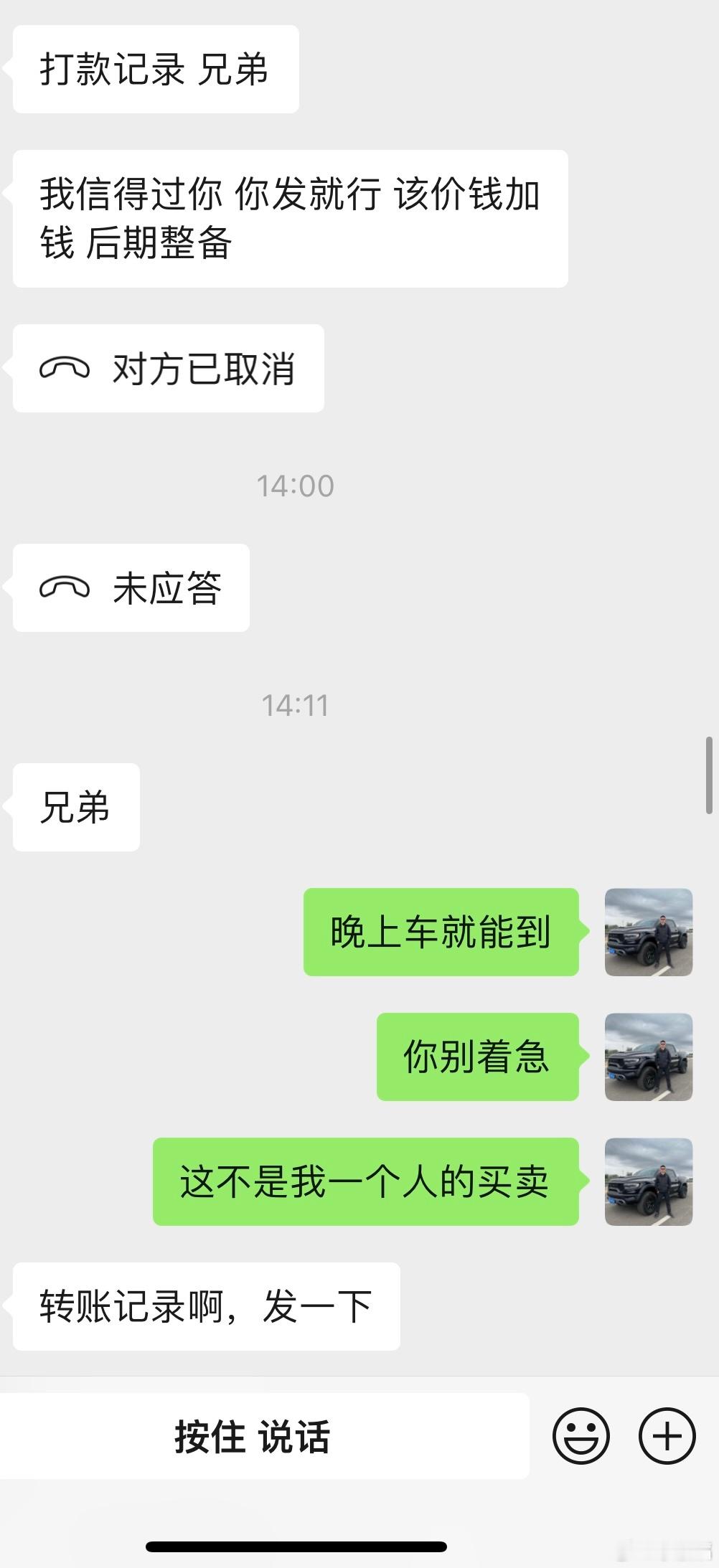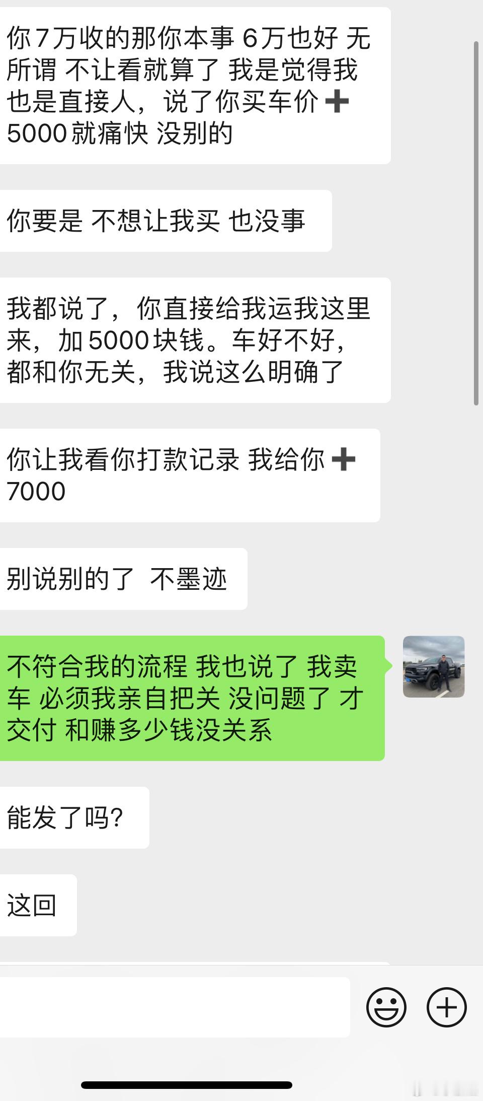 特别恼火的一个客户 上来问我多少钱收的我明确的告知他 我没有义务告知收车价格 你应该关注车辆品质一直给我打电话 在电话里一直说 你多少钱收的 我说我完全可以编一个高价 但是没必要 因为在电话里 他一直追问 OK我告知他真实的收车价格(我也不想骗人) 立马要求我把转账记录发给他 我可以发给他但是不想这样做 !!!我为啥要发给你??? 然后进行一系列的道德绑架随后就是 收车价➕5000 我不答应(因为还有审车、物流 人工成本)最后还是不赚钱我说我有费用 立马又给我算费用多少钱!道德绑架开始 ➕7000还不行???这一系列魔幻操作 让我感觉到我是个黑心车商就是道德绑架 很被动!!!!这大哥的执念就是 你多钱收的 把转账记录发给我 车况无所谓不用保证!我觉得我全程配合他把转账记录发给他 这生意做的没尊严 不舒服。而且他➕5000我不同意卖 随后就会➕7000还不行???这样超级被动!!!不要这样的买卖以后找我要转账记录的客户一律勿扰!!!!!