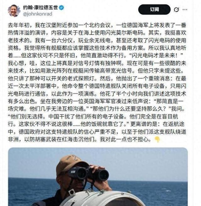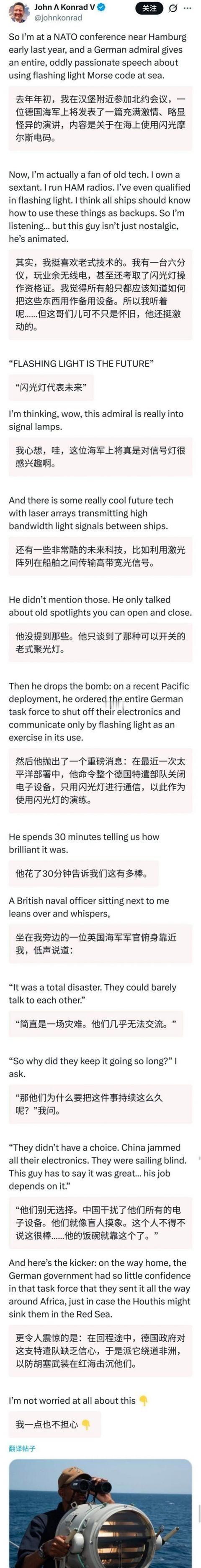 外媒爆料的一个劲爆消息德国军舰在过航台海的时候遭到强大电子干扰整只舰队成为了瞎子,最后不得已只能采用灯光通信 这件事得从2024年9月13日说起。那天德国海军派出“巴登·符腾堡”号护卫舰和“法兰克福”号补给舰穿越台湾海峡。德国官方当时高调宣传,说这是为了维护航行自由,强调台湾海峡是国际水道。这两艘舰艇属于德国海军F125级主力护卫舰和大型补给舰,排水量都不小,装备也算先进,德国海军上一次派舰过台湾海峡还是2002年,隔了二十多年,这次算是重返印太地区的一次高调动作。 德国国防部长鲍里斯·皮斯托里乌斯公开表态,这次行动完全符合国际法,舰队指挥官费利克斯·施托克也对外说会保持专业姿态。出发前德国方面还特意选了从南海北上穿越的路线,摆明了想刷存在感,顺便给某些盟友递个信号。 中国国防部发言人吴谦当天就回应,东部战区组织海空兵力对德舰实施全程跟监警戒。台湾防务部门通报显示,当天海峡空域有5架次战机和无人机活动,西南空域有16架次战机巡航,海面还有6艘军舰和1艘公务船值守。这种部署密度不是随便玩玩的,覆盖了空中、海面多个层面。 结果就是,德国舰队在穿越过程中电子设备集体出问题。雷达屏幕全是雪花,导航系统坐标乱飘,无线电里只有沙沙声,卫星通信也断断续续。整支编队瞬间变成“瞎子”和“聋子”,现代军舰没了电子系统,基本就跟漂着的铁块差不多。德国人没办法,只能关掉大部分电子设备,改用最原始的灯光通信。信号员站在舰桥两侧,用强光灯打摩尔斯码,互相传递简单指令,比如保持航向、调整速度这种。整个过程持续了好几个小时,效率低得可怜。 德国官方事后一句话没提设备失灵,通报里只说穿越顺利,一切正常。中国这边也没公开说具体用了什么手段,但从部署规模和以往能力看,电磁压制是完全做得到的。香港《南华早报》之前就报道过,解放军电子战部队在南海用车载系统模拟航母战斗群信号,把美军P-8A反潜机耍了45分钟,诱导它在空域里转圈圈。那次是2023年的事,证明了干扰和欺骗能力已经很成熟。台海周边常态化巡航加上电子侦察机,压制两艘欧洲舰艇的技术门槛并不高。 德国吃了这亏后,官方全程保持沉默,既没抗议也没指责。为什么?因为说出去就是自曝其短。自己主动上门秀肌肉,结果被摁着头走完全程,传出去全世界都会当成笑话。德国海军后来在北约场合把这事包装成“战术演练”,说关电子设备用闪光灯通信是测试应急能力。结果一位英国海军军官在美国记者面前私下戳破,说那根本不是演练,是被迫的,德国人根本没得选。 更说明问题的,是返航路线。正常从亚洲回欧洲,最短走红海过苏伊士运河。但德国直接下令绕道非洲好望角,多烧几百吨油,多花几十天时间。红海当时胡塞武装天天用无人机和导弹打船,风险确实不小,但胡塞的装备和技术水平跟台海的电磁环境比差太远。德国舰队连这点风险都不敢冒,只能说明台海那次经历把他们打出心理阴影了。F125级护卫舰防空能力本来就不算顶尖,面对不确定威胁时底气明显不足。 这件事后来在西方圈子里传开,外媒零星爆料,美国一些军事记者在社交平台上提过北约会议上的小道消息,英国军官那句“他们别无选择”成了经典。德国海军整体士气和信心都受影响,后续印太部署也变得小心翼翼。2025年他们还去格陵兰附近海域活动,喊着要对抗所谓威胁,但跟之前高调过台海比,调门低了不少。 说白了,这事撕开了一个现实:西方海军过去习惯了在别人家门口低成本秀肌肉,以为派两艘船就能刷存在感。现在时代不一样了,台海不是随便撒野的地方。德国舰队用自己的经历证明,航行自由这四个字,说起来容易,做起来要看实力说话。欧洲国家在亚太碰壁的案例越来越多,他们慢慢得适应这种新常态。德国这次没吃大亏,但也算交了学费,记性应该挺深的。