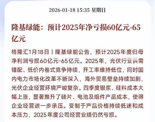 截至2026年1月18日,光伏行业多家龙头发布2025年业绩预亏公告,核心名单按预亏规模整理如下(数据均来自公司公告): 光伏亏损股名单: 1. 通威股份(600438):预亏90亿—100亿元,供需错配、成本高企、工业硅业务拖累 2. TCL中环(002129):预亏82亿—96亿元,硅片价格下行、库存减值、成本压力大 3. 隆基绿能(601012):预亏60亿—65亿元,行业低价内卷,四季度银浆、硅料成本大涨 4. 晶澳科技(002459):预亏45亿—48亿元,产能过剩、价格承压、贸易壁垒影响 5. 天合光能(688599):全年预亏(前三季度已亏42亿元),组件量价齐跌、成本高企 6. 晶科能源(688223):全年预亏(前三季度已亏39.2亿元),行业竞争加剧、成本倒挂 7. 爱旭股份(600732):预亏超10亿元,电池片价格低迷、库存减值、产能利用率不足 8. 大全能源(688303):预亏超10亿元,上半年硅料价格低迷,Q3单季扭亏 9. 亿晶光电(600537):预亏4.5亿—6亿元,组件量价齐跌、低效产能拖累,期末净资产为负,面临退市风险 ………………………………………. 亏损核心原因: 1、行业性供需错配,低价内卷持续,开工率低位 2、四季度银浆、硅料等成本大涨,成本倒挂加剧 3、海外贸易壁垒、需求增长放缓,价格传导受阻 4、资产减值、库存损失、转型/扩产成本叠加 …………………………………..