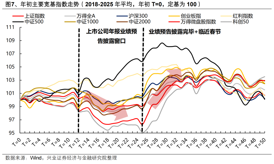 参考历史经验,从年初行情节奏上来看,年报业绩预告披露窗口(1月下半月)指数本身面临一定的调整压力,尤其是对缺乏基本面支撑的小微盘影响较大。