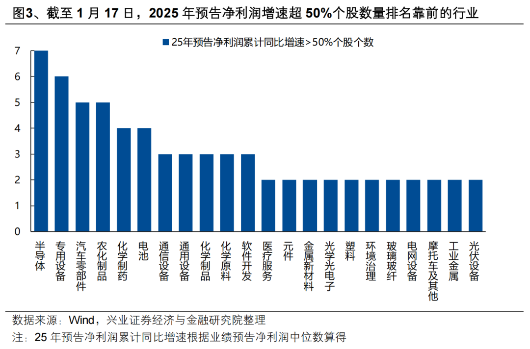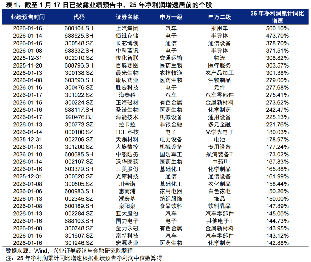 基本面层面,低基数下,本轮年报预告上市公司业绩验证压力整体不大,反而是一些结构性的亮点有望对行情形成提振。截至1月17日,已有363家A股上市公司发布2025年年报业绩预告,其中预告净利润增速超50%的个股有111家,主要集中在电子(存储、半导体设备、元件、光学光电子)、通信设备、新能源(电池、电网设备、光伏设备)、有色(金属新材料、工业金属)、医药(化学制药、医疗服务)、机械(专用设备、通用设备)、化工等领域,有望为结构性机会提供指引线索。