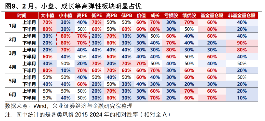 随着1月业绩预告披露完毕,2月重回基本面空窗期,叠加临近春节流动性充裕,一直到两会前都是市场躁动的核心窗口,风格上也是小微盘、成长等高弹性板块表现更好,届时市场向上弹性有望再一次打开。基本面空窗期市场风险偏好抬升,市场迎来一段典型的由流动性和风险偏好驱动的躁动窗口。日历效应看,2月是主要指数全年胜率最高的月份之一,结构上也以小微盘、成长等高弹性板块明显占优,有望是本轮春季行情再创新高的核心做多窗口。