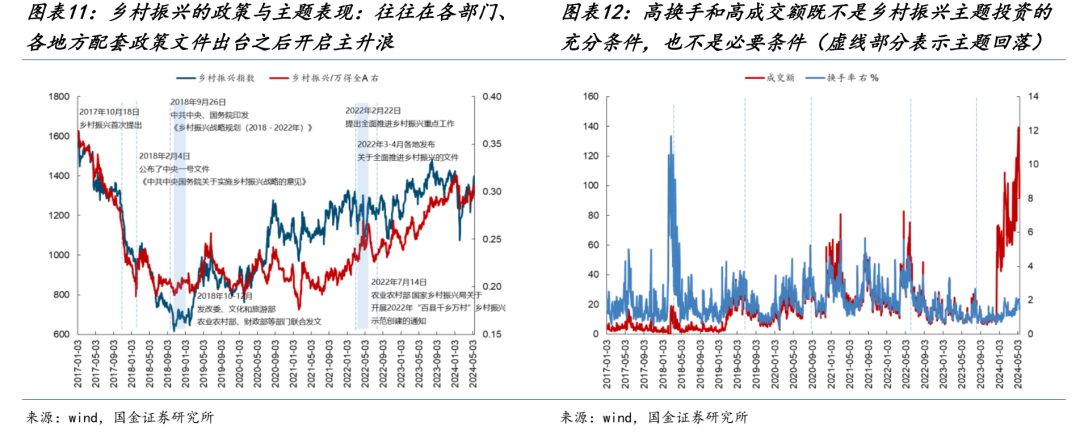 (1)对于政策类主题而言,我们以乡村振兴为例:往往政策类主题行情开启都在政策文件明确出台之后,但中间会由于市场对于政策的认知和落地预期导致主题行情的波折,最终政策主题的终结主要来自政策催化停滞叠加上市公司业绩迟迟未见兑现。具体来看:2017年10月18日乡村振兴首次提出,但乡村振兴指数却大幅下跌并跑输市场,市场投资者对新提出的政策概念并不“买账”。直到2018年2月4日中央一号文件出台之后,市场才开始有所反应,但行情也并未持续很久。2018年9月26日,2018-2022年乡村振兴战略规划出台,市场并未立刻上涨,而是等到发改委等多个部门联合发文对乡村振兴进行进一步支持之后,乡村振兴主题开始触底反弹并跑赢全A。2022年Q1也是如此,2022年2月22日提出一号文件之后市场并未立刻上涨,而是等到3-4月各地政府发布相关文件、7月农业农村部联合国家乡村振兴局发布“百县千乡万村”之后开始趋势性行情。值得注意的是,并非所有的高换手和高成交额时刻都对应着行情的终结,而是会维持一段时间。